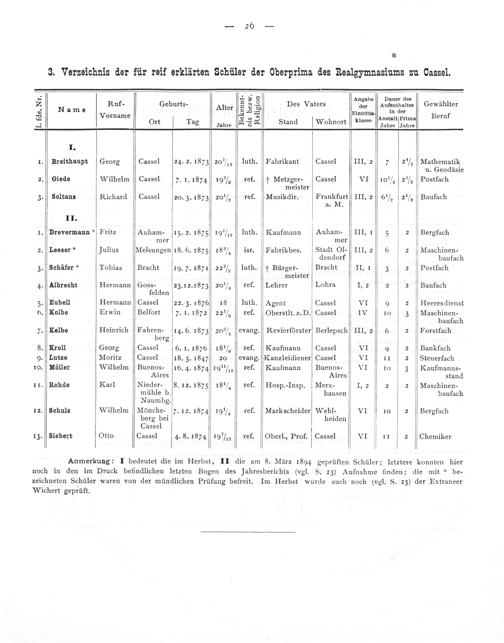 3. Verzeichnis der für reif erklärten Schüler der Oberprima des Realgymnasiums zu Cassel.
