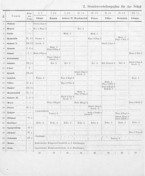 — 2. DerrSiars 5. 11 Krauth irr 2b Gesch. 3 ——— 12 Stehlich—-— PFranz. 4 FPrnz. 4 Engl. 3 Engl. 3 ——. errereprg 3uch E eeee 13 Völler. 2 a Phys. 3 Chm. 2 Phys. 3 NiRe... —————õ—ℳé ⸗6é-⸗⸗—8—::iee 4nnrd5 1.DenLer lnan 1Erawde B . Mnk- 5. Erdsdel.... 33ATaenreieh. de ſ ſeſ. lir.. a... TIICAbFJh. wððʒdd n 3 16Sichert L. 1. eh.e... ded ö 17 Meyer Frnz. 4 Engl.3 Frnz. 4Engl. 8 rnZ. 5 Erdk.2 — D-II. geõͤ veeeen 18 Peters I. 1⁄ Gesch. 3 vVorturnerstunde. 8— Tien o wee Deaer 4EnELh V Lupnen 3. rWere UekS arg 2. Dichnre V V Gech 2Lrdkkl1.. e= 21 Karbiner Zchn. 2 Zchn. 2 22 Spangenberg 23 Jürgens Rel. 2 Turn. 3 1 Chorsingen... 5...„..... 24 Erdmann IV b T Turnen 3 25 Braun— Katholischer Religions-Unterricht in 3 Abteilungen 26 Stein.— Vrraelitischer Religionsunterricht, in 2 Abteilungen. 8 35 35 35 35 95 35 35 35
