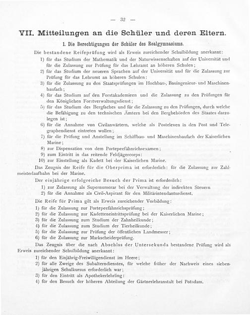 Das Zeugnis über die nach Abschlss der Untersekunda bestandene Prüfung wird als Erweis zureichender Schulbildung anerkannt: 1) für den Einjährig-Freiwilligendienst im Heere; 2) für alle Zweige des Subalterndienstes, für welehe früher der Nachweis eines sieben- jährigen Schulkursus erforderlich war; 3) für den Eintritt als Apothekerlehrling: 4) für den Besuch der höheren Abteilung der Gärtnerlehranstalt bei Potsdam.
