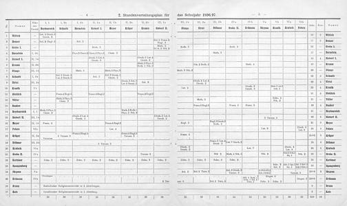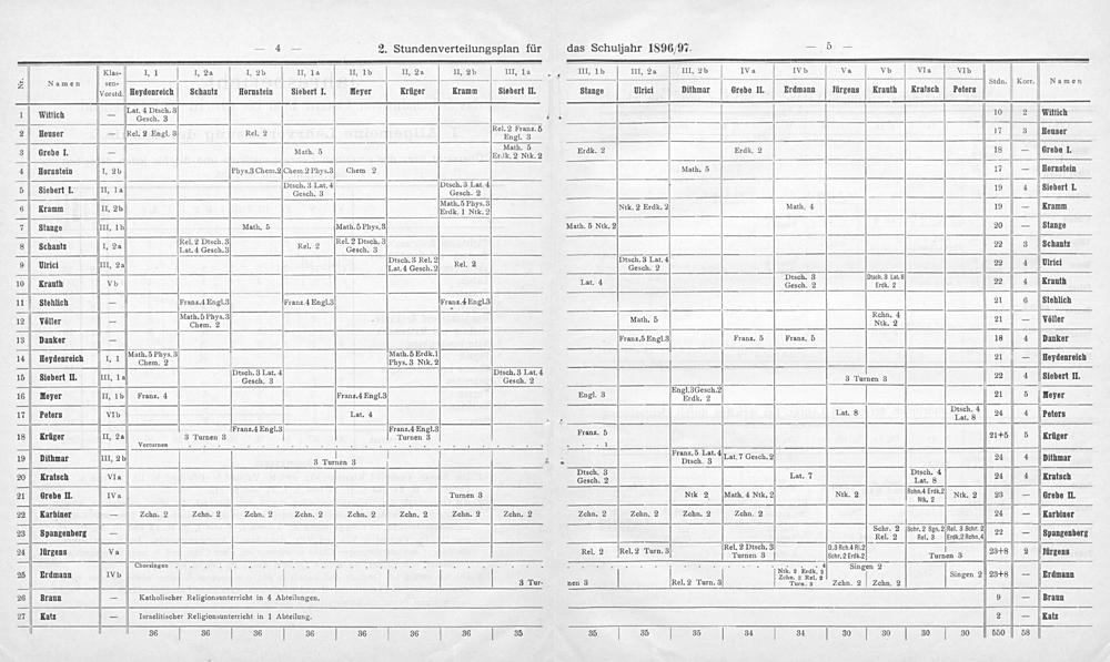 — 4— 2. Stundenverteilungsplan für das Schuljahr 1896/97.—— Klas- 1, 1 I, 2 a I, 2 b II, 1 a II, 1 b II, 2a II, 2 b III, 1 a III, 1 b III, 2 a III, 2 b IVa IVb Va Vb VIa VIb 5 Namen sen-—— 4— Stdn. Korr. Namen Vorstd. Heydenreich Schantz Hornstein Siebert I. Meyer Krüger Kramm siebert II. Stange Vlrici Dithmar Grebe II. Erdmann lürgens Krauth Kratsch Peters 44 Lat. 4 Dtsch. 3. 1 Wittich— Gesch. 3 10 2 Wittich Rel. 2 Franz. 5 2 UHeuser— Rel. 2 Engl. 3 Rel. 2 Engl. 3 17 3 Heuser — Math. 5 2— 3 Grebe I.— Math. 5 Er.k. 2 Ntk. 2 Erdk. 2 Erdk. 2 18 Grebe I. 4 ÜHornstein I, 2 b Phys. 3 Chem. 2 Chem. 2 Phys.34 Chem 2 Math. 5 17— UHornstein Dtsch. 3 Lat. 4 Dtsch. 3 Lat. 4. 5 sdiebert I. II, 1a Gesch. 3 Gesch. 2 19 4 siebert I. Math. 5 Phys. 3 4 6 Kramm II, 2 b Erdk. 1 Nik. 2 Ntk. 2 Erdk. 2 Math. 4 19— ſramm 7 Stange III, 1 b Math. 5 Math. 5 Phys. 3 Math. 5 Ntk. 2 20—(Stange Rel. 2 Dtsch. 3 Rel. 2 Dtsch. 3 8 sSchantz I, 2 a Lat. 4 Gesch. 3 Rel. 2 Gesch. 3 22 3 ſSchantz 44 Dtsch. 3 Rel. 2 Dtsch. 3 Lat. 4 2 9 Ulrici III, 2 a Lat. 4 Gesch. 2 Rel. 2 Gesch. 2 22 4 Ulrici Dtsch. 3 Dtsch. 3 Lat. 8 10 Krauth vb Lat. 4 Peson. 3 a0e, 22 4 ſKrauth 11 Stehlich— Franz. 4 Engl. 3 Franz. 4 Engl. 3 Franz. 4 Engl. 3 21 6(sStehlich 5 Math. 5 Phys. 3 Rchn. 4 2 12 völler— Chem. 2 Math. 5 Ntk. 2 21— völler 13 Danker— Franz. 5 Engl. 3 Franz. 5 Franz. 5 18 4 Danker Math. 5 Phys. 3 Math. 5 Erdk. 1. 14 Heydenreich J, 1 Chem. 2 Phys. 3 Ntk. 2 21—-—(Heydenreich 4 Dtsch. 3 Lat. 4 Dtsch. 3 Lat. 4 15 sSiebert II. III, 1 a Gesch. 3 Gesch. 2 3 Turnen 3 22 4 Siebert II. Engl. 3Gesch. 2. 16 HNeyer II, 1b Franz. 4 Franz. 4 Engl. 3 Engl. 3 Prdk. 2 21 5 Neyer 17 keters VIb Lat. 4 Lat. 8 Disch4 24 4 ſeters Franz. 4 Engl. 3 Franz. 4 Engl. 3 18 Krüger II, 2 a 3 Turnen 3 Turnen 3 Franz. 5 2145 5 ſrüger Vorturnen......, 1 3 ſ Franz. 5 Lat. 4 19 Dithmar III, 2 b 3 Turhen 3 Dtsch. 3 Lat. 7 Gesch. 2 24 4 Dithmar Dtsch. 3 Dtsch. 4 20 Kratsch VIa Gesch. 2 Lat. 7 Lau. 8 24 4 Kratsch 21 Grebe II. IVa Turnen 3 Ntk 2 Math. 4 Ntk. 2 Ntk. 2 Lodu Lee Ntk. 2 23— grebe II. 22 Karbiner— Zchn. 2 Zchn. 2 Zchn. 2 Zchn. 2 Zchn. 2 Zchn. 2 Zchn. 2 Zchn. 2 Zchn. 2 Zchn. 2 Zchn. 2 Zchn. 2 24— ſKarbiner — Schr. 2 ſSchr. 2 Sgn. 2ftel. 3 Schr. 2— 23 Spanganberg Rel. 2 fei. 8 ſErui. 2Rchn. 4„*22 Spangenberg Rel. 2 Dtsch. 3 D. 3Rch 4 R.. 2 2 V.2. D 4 lürgens 4 Rel. 2 Kel. 2 Turn. 3 Turnen 3 Schr. 2 Erdk.2 Tumen 3 23 18 2 Iürgens Chorsingen. 1— 1 Singen 2 25 Erdmann IVb V V N Era. 2 Singen 2 23+ 8— Erdmann 3 Tur- nen 3 Rel. 2 Turn. 3 Turn. 3 Zchn. 2 Zchn. 2 26 Braun— Katholischer Religionsunterricht in 4 Abteilungen. 9— Braun 27 Katz— Israelitischer Religionsunterricht in 1 Abteilung. 2— Katz 36 36 36 36 36 36 36 3⁵5 35 35 35 34 34 30 30 3⁰ 30 550 58