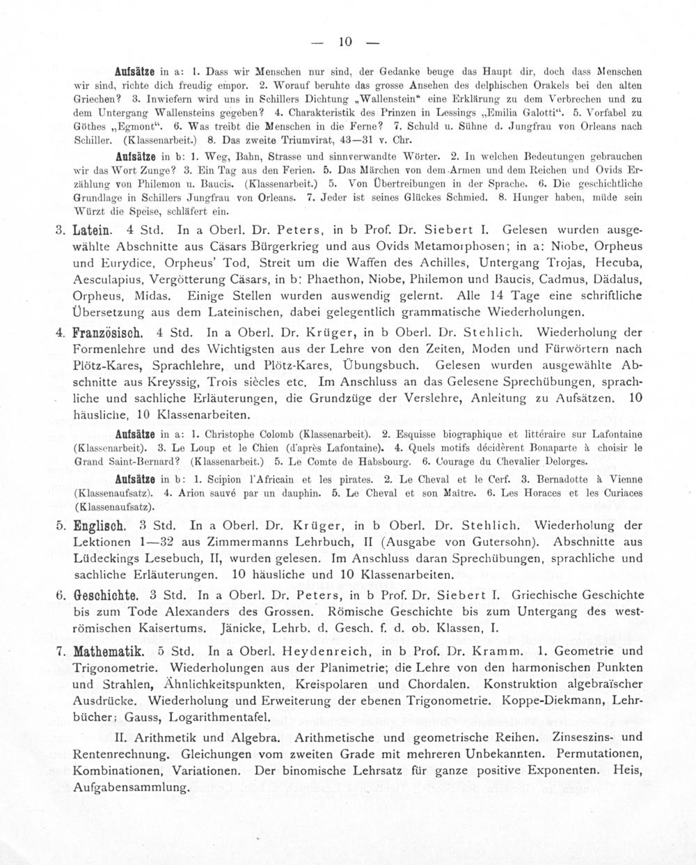 Französisch. 4 Std. In a Oberl. Dr. Krüger, in b Oberl. Dr. Stehlich. Wiederholung der Formenlehre und des Wichtigsten aus der Lehre von den Zeiten, Moden und Fürwörtern nach Plötz-Kares, Sprachlehre, und Plötz-Kares, UÜbungsbuch. Gelesen wurden ausgewählte Ab- schnitte aus Kreyssig, Trois siècles etc. Im Anschluss an das Gelesene Sprechübungen, sprach- liche und sachliche Erläuterungen, die Grundzüge der Verslehre, Anleitung zu Aufsätzen. 10 häusliche, 10 Klassenarbeiten.