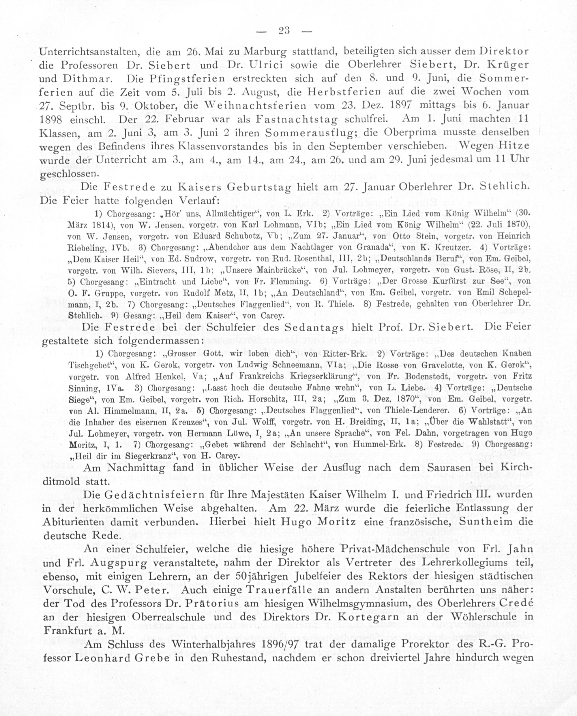 An einer Schulfeier, welche die hiesige höhere Privat-Mädchenschule von Frl. Jahn und Frl. Augspurg veranstaltete, nahm der Direktor als Vertreter des Lehrerkollegiums teil, ebenso, mit einigen Lehrern, an der 50 jährigen Jubelfeier des Rektors der hiesigen städtischen Vorschule, C. W. Peter. Auch einige Trauerfälle an andern Anstalten berührten uns näher: der Tod des Professors Dr. Prätorius am hiesigen Wilhelmsgymnasium, des Oberlehrers Credé an der hiesigen Oberrealschule und des Direktors Dr. Kortegarn an der Wöhlerschule in Frankfurt a. M.