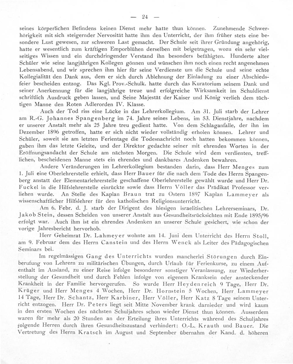 Andere Veränderungen im Lehrerkollegium bestanden darin, dass Herr Menges zum 1. Juli eine Oberlehrerstelle erhielt, dass Herr Bauer für die nach dem Tode des Herrn Spangen- berg anstatt der Elementarlehrerstelle geschaffene Oberlehrerstelle gewählt wurde und Herr Dr. Fuckel in die Hilfslehrerstelle einrückte sowie dass Herrn Völler das Prädikat Professor ver-— liehen wurde. An Stelle des Kaplan Braun trat zu Ostern 1897 Kaplan Lammeyer als wissenschaftlicher Hilfslehrer für den katholischen Religionsunterricht.