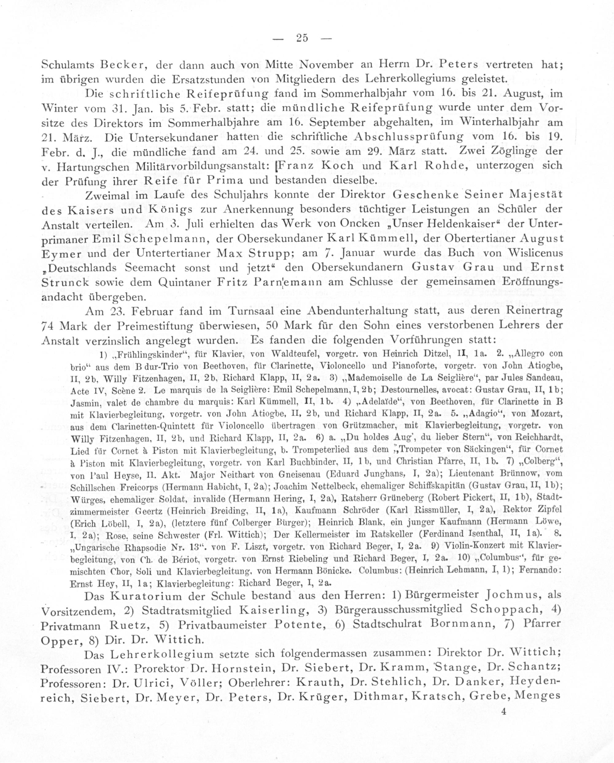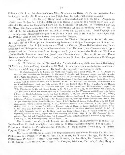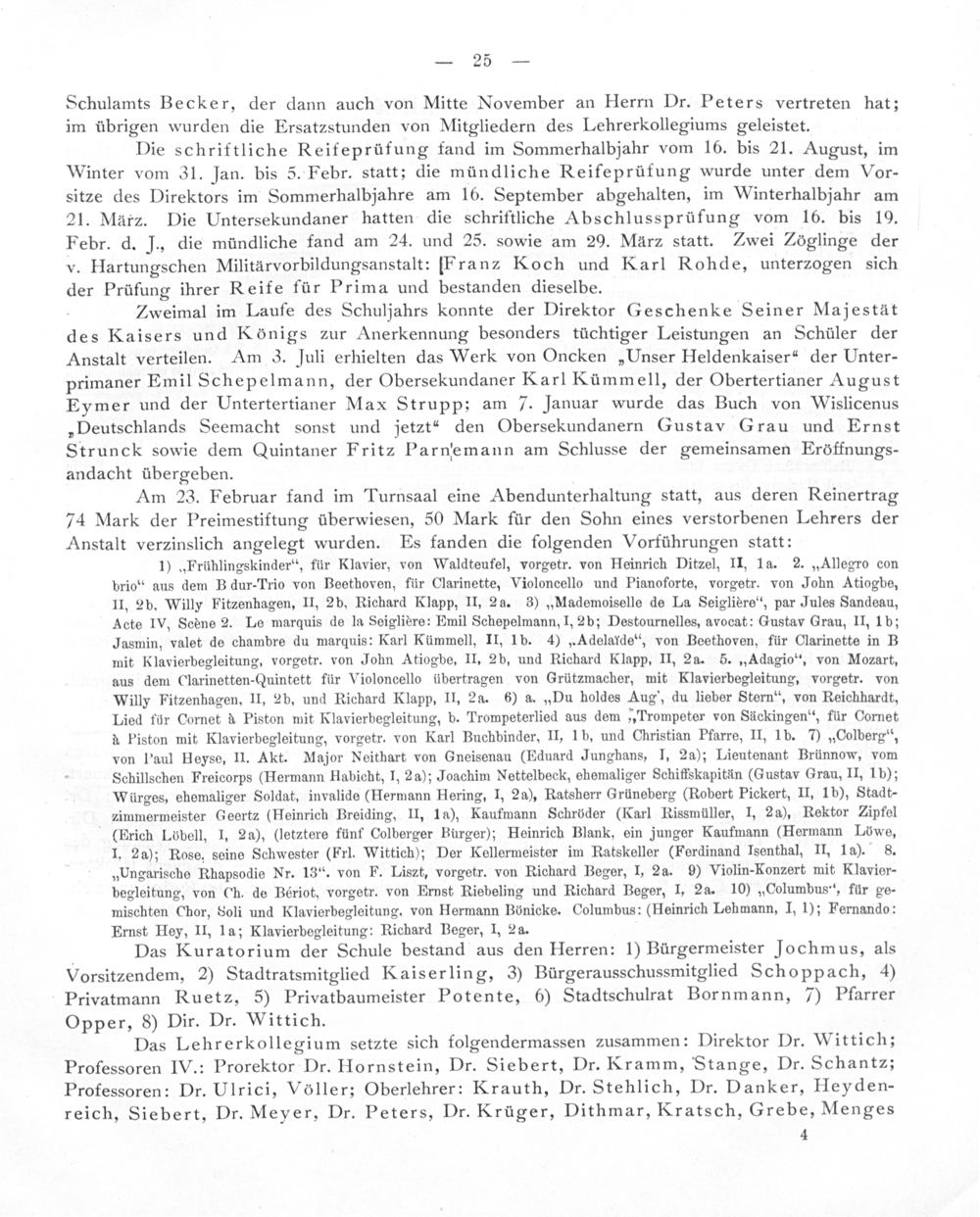 Das Lehrerkollegium setzte sich folgendermassen zusammen: Direktor Dr. Wittich; Professoren IV.: Prorektor Dr. Hornstein, Dr. Siebert, Dr. Kramm, Stange, Dr. Schantz; Professoren: Dr. Ulrici, Vôller; Oberlehrer: Krauth, Dr. Stehlich, Dr. Danker, Heyden- reich, Siebert, Dr. Meyer, Dr. Peters, Dr. Krüger, Dithmar, Kratsch, Grebe, Menges