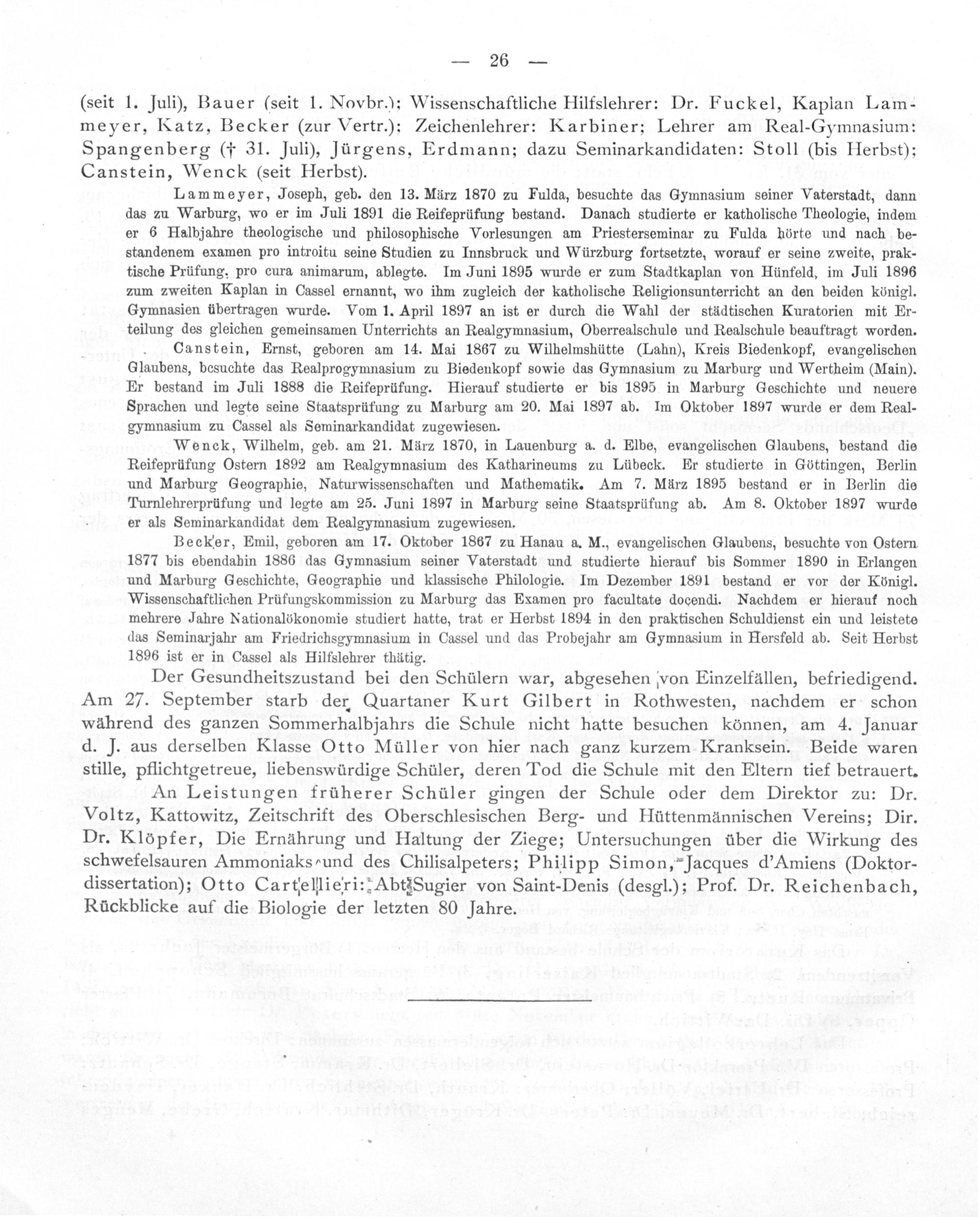 Lammeyer, Joseph, geb. den 13. März 1870 zu Fulda, besuchte das Gymnasium seiner Vaterstadt, dann das zu Warburg, wo er im Juli 1891 die Reifeprüfung bestand. Danach studierte er katholische Theologie, indem er 6 Halbjahre theologische und philosophische Vorlesungen am Priesterseminar zu Fulda hörte und nach be- standenem examen pro introitu seine Studien zu Innsbruck und Würzburg fortsetzte, worauf er seine zweite, prak- tische Prüfung. pro cura animarum, ablegte. Im Juni 1895 wurde er zum Stadtkaplan von Hünfeld, im Juli 1896 zum zweiten Kaplan in Cassel ernannt, wo ihm zugleich der katholische Religionsunterricht an den beiden königl. Gymnasien übertragen wurde. Vom 1. April 1897 an ist er durch die Wahl der städtischen Kuratorien mit Er- teilung des gleichen gemeinsamen Unterrichts an Realgymnasium, Oberrealschule und Realschule beauftragt worden.