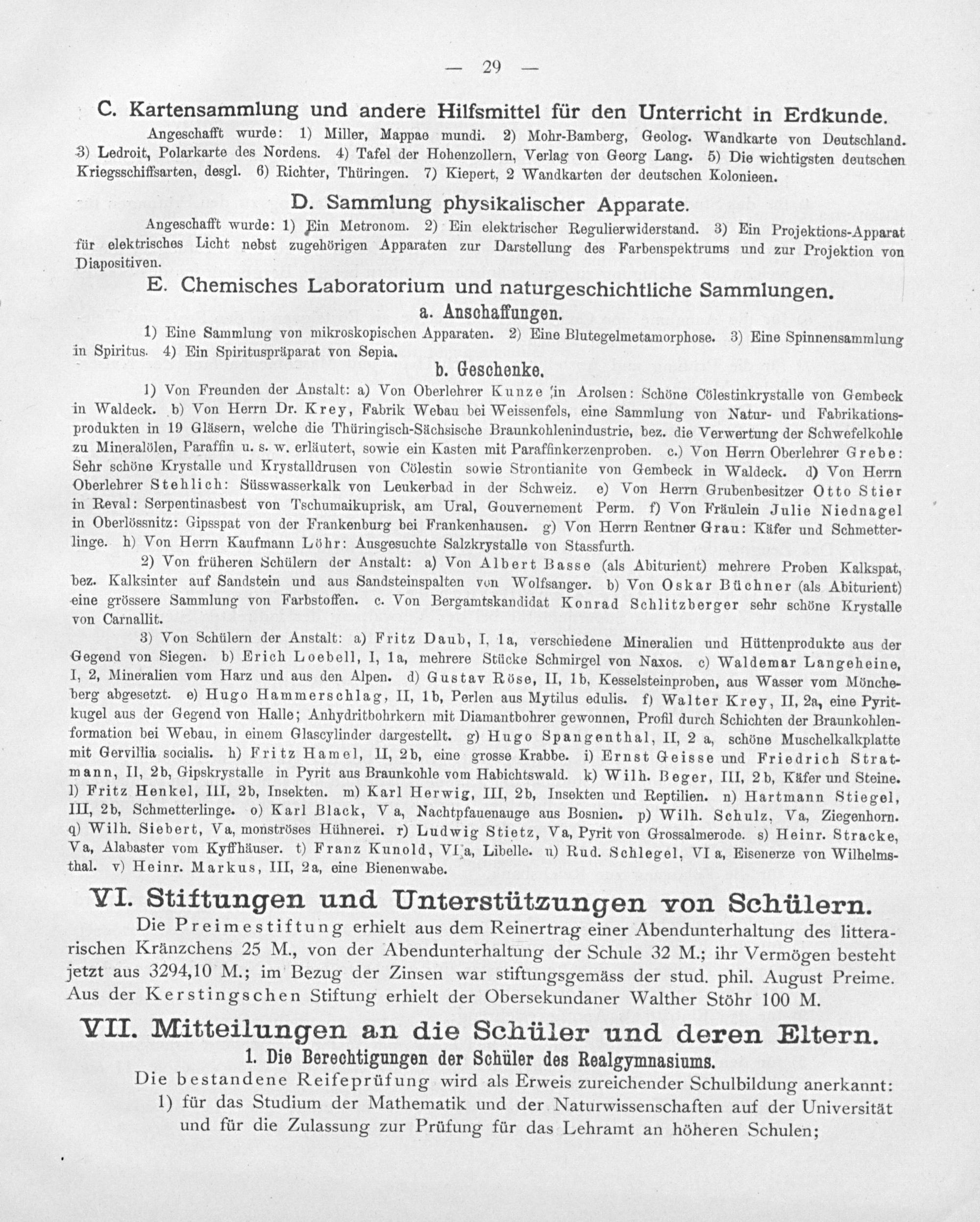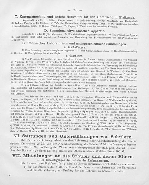 VI. Stiftungen und Unterstützungen von Schülern. Die Preimestiftung erhielt aus dem Reinertrag einer Abendunterhaltung des littera- rischen Kränzchens 25 M., von der Abendunterhaltung der Schule 32 M.; ihr Vermögen besteht jetzt aus 3294,10 M.; im Bezug der Zinsen war stiftungsgemäss der stud. phil. August Preime. Aus der Kerstingschen Stiftung erhielt der Obersekundaner Walther Stéhr 100 M.