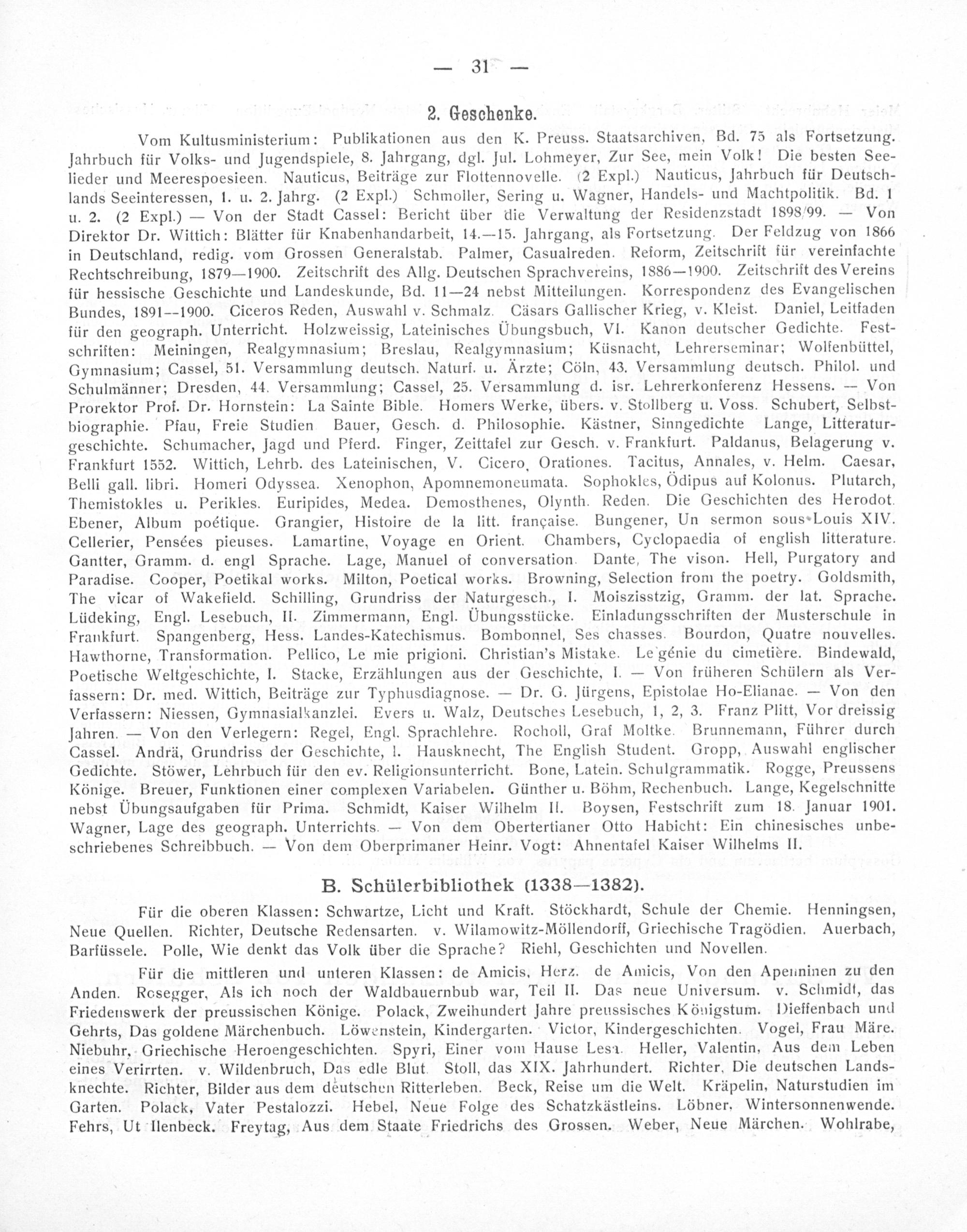 Vom Kultusministerium: Publikationen aus den K. Preuss. Staatsarchiven, Bd. 75 als Fortsetzung. Jahrbuch für Volks- und Jugendspiele, S. Jahrgang, dgl. Jul. Lohmeyer, Zur See, mein Volk! Die besten See- lieder und Meerespoesieen. Nauticus, Beiträge zur Flottennovelle.(2 Expl.) Nauticus, Jahrbuch für Deutsch- lands Seeinteressen, l. u. 2. Jahrg.(2 Expl.) Schmoller, Sering u. Wagner, Handels— und Machtpolitik. Bd. 1 u. 2.(2 Expl.)— Von der Stadt Cassel: Bericht über die Verwaltung der Residenzstadt 1898/99.— Von Direktor Dr. Wittich: Blätter für Knabenhandarbeit, 14.— 15. Jahrgang, als Fortsetzung. Der Feldzug von 1866 in Deutschland, redig. vom Grossen Generalstab. Palmer, Casualreden. Reform, Zeitschrift für vereinfachte Rechtschreibung, 1879— 1900. Zeitschrift des Allg. Deutschen Sprachvereins, 1886— 1900. Zeitschrift des Vereins für hessische Geschichte und Landeskunde, Bd. 11— 24 nebst Mitteilungen. Korrespondenz des Evangelischen Bundes, 1891— 1900. Ciceros Reden, Auswahl v. Schmalz. Cäsars Gallischer Krieg, v. Kleist. Daniel, Leitfaden für den geograph. Unterricht. Holzweissig, Lateinisches Übungsbuch, VI. Kanon deutscher Gedichte. Fest- schriften: Meiningen, Realgymnasium; Breslau, Realgymnasium; Küsnacht, Lehrerseminar; Wolfenbüttel, Gymnasium; Cassel, 51. Versammlung deutsch. Naturf. u. Arzte; Cöln, 43. Versammlung deutsch. Philol. und Schulmänner; Dresden, 44. Versammlung; Cassel, 25. Versammlung d. isr. Lehrerkonferenz Hessens.— Von Prorektor Prof. Dr. Hornstein: La Sainte Bible. Homers Werke, übers. v. Stollberg u. Voss. Schubert, Selbst-— biographie. Pfau, Freie Studien Bauer, Gesch. d. Philosophie. Kästner, Sinngedichte Lange, Litteratur- geschichte. Schumacher, Jjagd und Pferd. Finger, Zeittafel zur Gesch. v. Frankfurt. Paldanus, Belagerung v. Frankfurt 1552. Wittich, Lehrb. des Lateinischen, V. Cicero. Orationes. Tacitus, Annales, v. Helm. Caesar, Belli gall. libri. Homeri Odyssea. Xenophon, Apomnemoneumata. Sophokles, Ödipus auf Kolonus. Plutarch, Themistokles u. Perikles. Euripides, Medea. Demosthenes, Olynth. Reden. Die Geschichten des Herodot. Ebener, Album poétique. Grangier, Histoire de la litt. française. Bungener, Un sermon sous-Louis XIV. Cellerier, Pensées pieuses. Lamartine, Voyage en Orient. Chambers, Cyclopaedia of english litterature. Gantter, Gramm. d. engl Sprache. Lage, Manuel of conversation. Dante, The vison. Hell, Purgatory and Paradise. Cooper, Poetikal works. Milton, Poetical works. Browning, Selection from the poetry. Goldsmith, The vicar of Wakefield. Schilling, Grundriss der Naturgesch., I. Moiszisstzig, Gramm. der lat. Sprache. Lüdeking, Engl. Lesebuch, II. Zimmermann, Engl. UÜbungsstücke. Einladungsschriften der Musterschule in Frankfurt. Spangenberg, Hess. Landes-Katechismus. Bombonnel, Ses chasses. Bourdon, Quatre nouvelles. Hawthorne, Transformation. Pellico, Le mie prigioni. Christian's Mistake. Legénie du cimetière. Bindewald, Poetische Weltgeschichte, I. Stacke, Erzählungen aus der Geschichte, I.— Von früheren Schülern als Ver— fassern: Dr. med. Wittich, Beiträge zur Typhusdiagnose.— Dr. G. Jürgens, Epistolae Ho-Elianae.— Von den Verfassern: Niessen, Gymnasialkanzlei. Evers u. Walz, Deutsches Lesebuch, 1, 2, 3. Franz Plitt, Vor dreissig Jahren.— Von den Verlegern: Regel, Engl. Sprachlehre. Rocholl, Graf Moltke. Brunnemann, Führer durch Cassel. Andrä, Grundriss der Geschichte, l. Hausknecht, The English Student. Gropp, Auswahl englischer Gedichte. Stöwer, Lehrbuch für den ev. Religionsunterricht. Bone, Latein. Schulgrammatik. Rogge, Preussens Könige. Breuer, Funktionen einer complexen Variabelen. Günther u. Böhm, Rechenbuch. Lange, Kegelschnitte nebst UÜbungsaufgaben für Prima. Schmidt, Kaiser Wilhelm Il. Boysen, Festschrift zum 18. Januar 1901. Wagner, Lage des geograph. Unterrichts.— Von dem Obertertianer Otto Habicht: Ein chinesisches unbe- schriebenes Schreibbuch.— Von dem Oberprimaner Heinr. Vogt: Ahnentafel Kaiser Wilhelms Il.