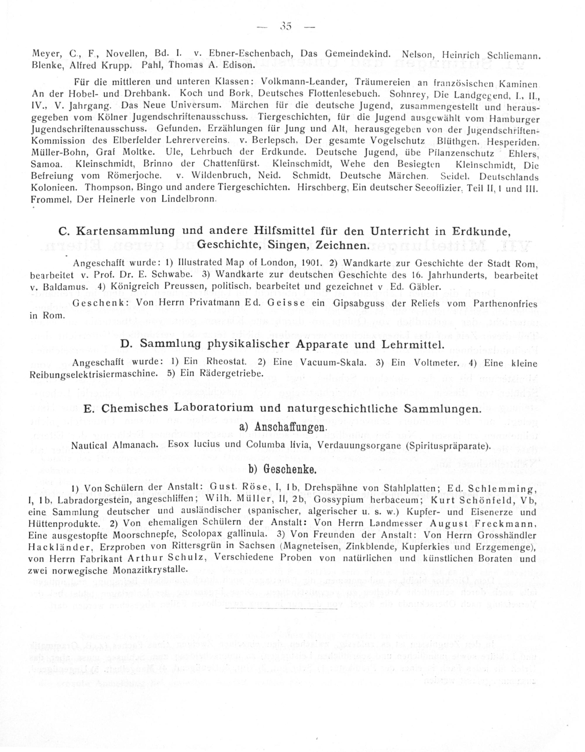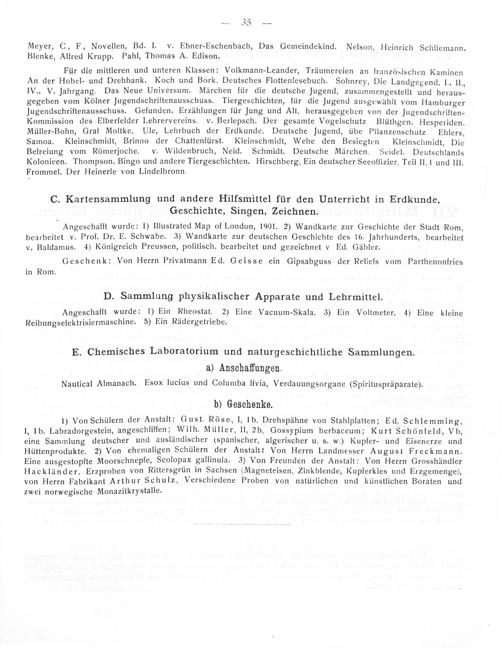 3 Angeschafft wurde: 1) Illustrated Map of London, 1901. 2) Wandkarte zur Geschichte der Stadt Rom, bearbeitet v. Prof. Dr. E. Schwabe. 3) Wandkarte zur deutschen Geschichte des 16. Jahrhunderts, bearbeitet v. Baldamus. 4) Königreich Preussen, politisch, bearbeitet und gezeichnet v Ed. Gäbler.