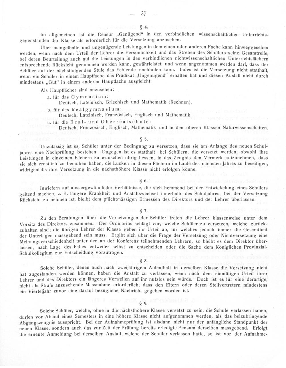 Zu den Beratungen über die Versetzungen der Schüler treten die Lehrer klassenweise unter dem Vorsitz des Direktors zusammen. Oer Ordinarius schlägt vor, welche Schüler zu versetzen, welche zurück- zuhalten sind; die übrigen Lehrer der Klasse geben ihr Urteil ab, für welches jedoch immer die Gesamtheit der Unterlagen massgebend sein muss. Ergibt sich über die Frage der Versetzung oder Nichtversetzung eine Meinungsverschiedenheit unter den an der Konferenz teilnehmenden Lehrern, so bleibt es dem Direktor über- lassen, nach Lage des Falles entweder selbst zu entscheiden oder die Sache dem Königlichen Provinzial- Schulkollegium zur Entscheidung vorzutragen.
