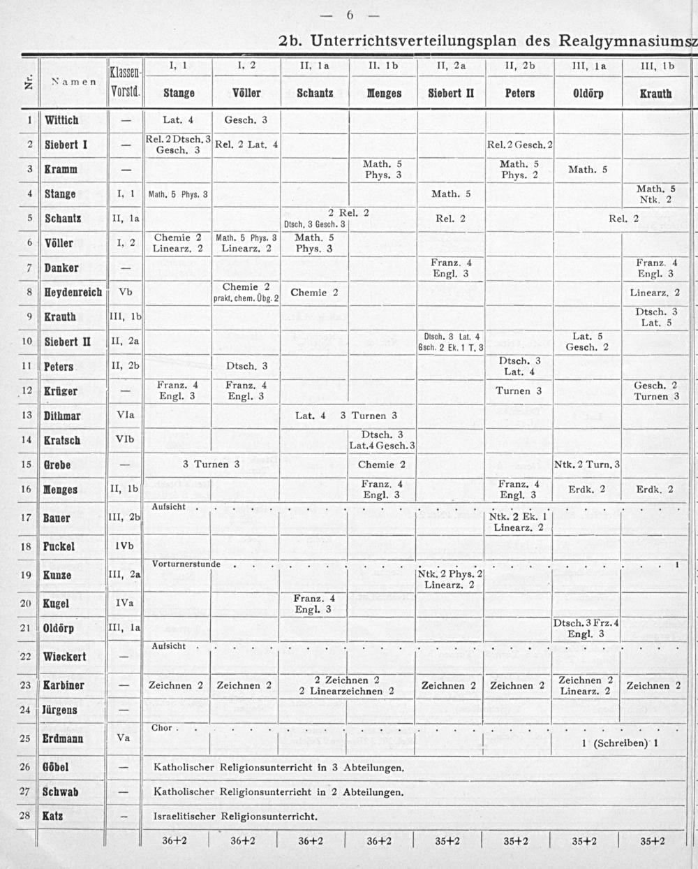 ——— I, 1 1. 2 II, l a II. 1b II, 2 a II, 2 b III, 1 a III, 1 b 9. Klässell-. 2 Xamen— 3 Vorsld.) Stange völler Schantz Henges siebert II Peters Ooldörp Krauth 1 Wittich— Lat. 4 Gesch. 3 Rel. 2 Dtsch. 3 2 siebert 1— Gesch. 3 Rel. 2 Lat. 4 Rel. 2 Gesch. 2 Math. 5 Math. 5 3 Kramm— Phys. 3 Phys. 2 Math. 5 Math. 5 4 Stange I, 1 Math. 5 phys. 3 Math. 5 Ntk. 2 2 Rel. 2 5 Schantz II, 1a Ducn. 3 Gesch. 3 Rel. 2 Rel. 2 7 Chemie 2 Nath. 5 phys. 8 Math. 5 6 völler 1, 2 Linearz. 2 Linearz. 2 Phys. 3 4 Franz. 4 Franz. 4 7 Danker— Engl. 3 Engl. 3 5 Chemie 2.: 8 Heydenreich Vb pralt. onem. Obg.? Chemie 2 Linearz. 2 Dtsch. 3 9 Krauth III, 1b Lat. 5 . Dtsch. 3 Lat. 4 Lat. 5 10 Siebert II II. 22 Gsch. 2 Ek. 1 T. 3 Gesch. 2 Dtsch. 3 2 11 peters II, 2b Dtsch. 3 dac.⸗ . Franz. 4 Franz. 4 Gesch. 2 12 krüger 55 Engl. 3 Engl. 3 Turnen 3 Turnen 3 13 Dithmar VIa Lat. 4 3 Turnen 3 Dtsch. 3 14 Kratsch VIb Lat. 4 Gesch. 3 15 Grebe— 3 Turnen 3 Chemie 2 Ntk. 2 Turn. 3 Franz. 4 Franz. 4 2 16 NMenges II, 1b Engl. 3 Engl. 3 Erdk. 2 Erdk. 2 Aufsicht....... 17 Bauer III, 2 b Ntk. 2 Ek. 1 Linearz. 2 18 Puckel IVb Vorturnerstunde.... 1 19 Kunze III, 2a Ntk. 2 Phys. 2 Linearz. 2 Franz. 4 20 Kugel IVa Engl. 3 ₰ Dtsch. 3 Frz. 4 21 oOldörp III, 1a Engl. 3 Aufsicht 22 Wieckert— .. 2 Zeichnen 2. Zeichnen 2 23 Karbiner V— Zeichnen 2 Zeichnen 2 2 Lincarulchnen 2 Zeichnen 2 Zeichnen 2 Linearz. 2 Zeichnen 2 24 jürgens— Chor...... 25 Erdmann Ja 1(Schreiben) 1 26 Göbel— Katholischer Religionsunterricht in 3 Abteilungen. 27 Schwab— Katholischer Religionsunterricht in 2 Abteilungen. 28 Katz— Israelitischer Religionsunterricht. 36+2 36+£2 36+2 36+2 35 42 35+42 35+2 35+ 2