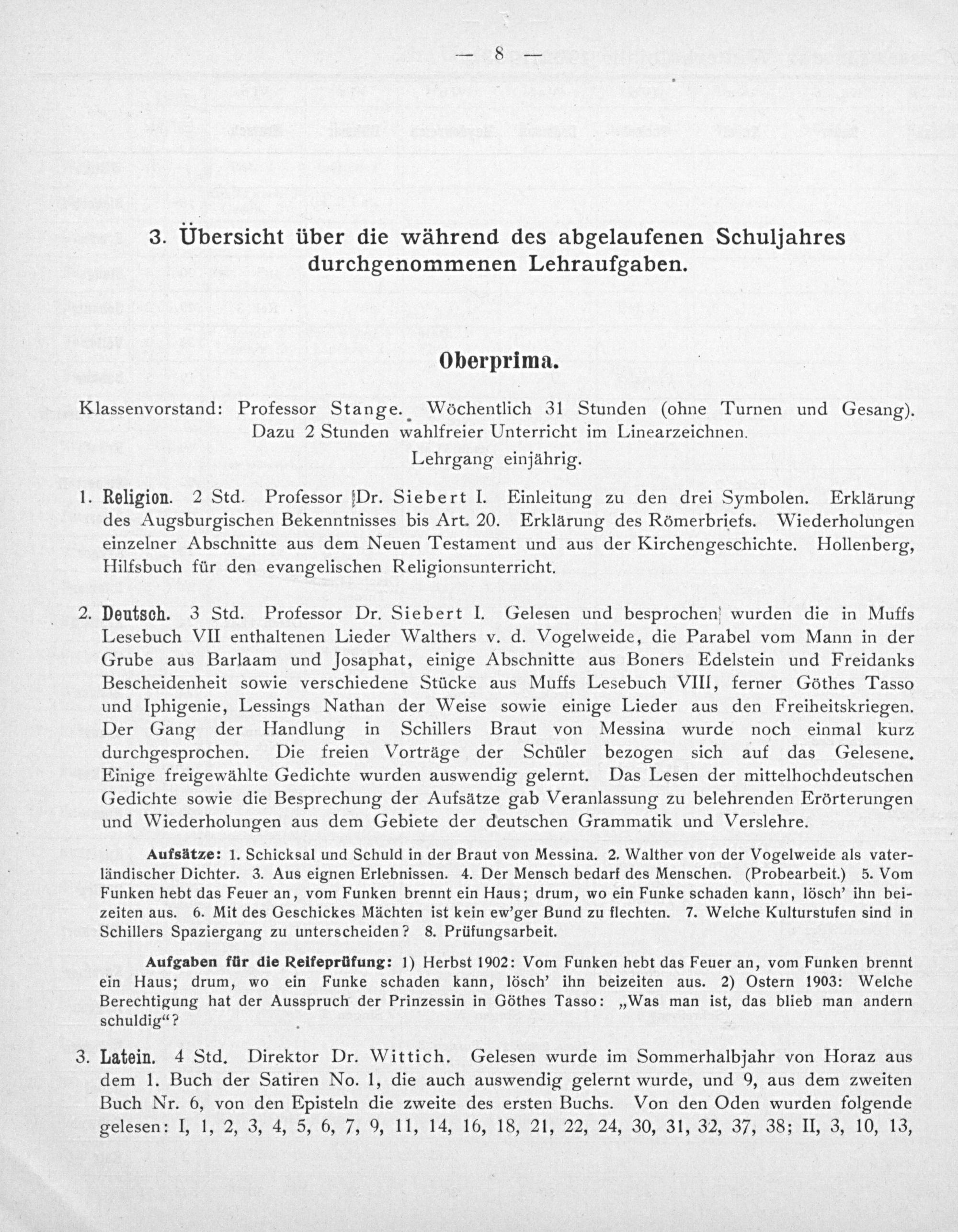 2. Deutsch. 3 Std. Professor Dr. Siebert I. Gelesen und besprochen] wurden die in Muffs Lesebuch VII enthaltenen Lieder Walthers v. d. Vogelweide, die Parabel vom Mann in der Grube aus Barlaam und Josaphat, einige Abschnitte aus Boners Edelstein und Freidanks Bescheidenheit sowie verschiedene Stücke aus Muffs Lesebuch VIII, ferner Göthes Tasso und Iphigenie, Lessings Nathan der Weise sowie einige Lieder aus den Freiheitskriegen. Der Gang der Handlung in Schillers Braut von Messina wurde noch einmal kurz durchgesprochen. Die freien Vorträge der Schüler bezogen sich auf das Gelesene. Einige freigewählte Gedichte wurden auswendig gelernt. Das Lesen der mittelhochdeutschen Gedichte sowie die Besprechung der Aufsätze gab Veranlassung zu belehrenden Erörterungen und Wiederholungen aus dem Gebiete der deutschen Grammatik und Verslehre.
