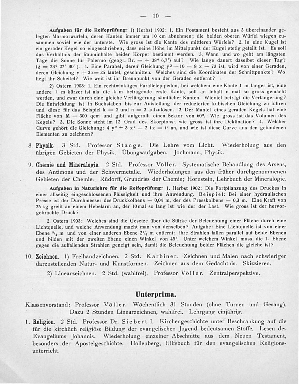 9. Chemie und Mineralogie. 2 Std. Professor Völler. Systematische Behandlung des Arsens, des Antimons und der Schwermetalle. Wiederholungen aus den früher durchgenommenen Gebieten der Chemie. Rüdorff, Grundriss der Chemie; Hornstein, Lehrbuch der Mineralogie.