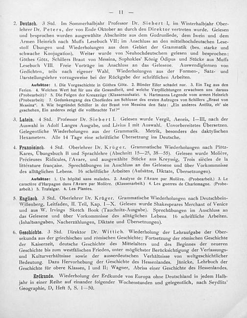 Aufsätze: l. Die Vorgeschichte in Göthes Götz. 2. Blinder Eifer schadet nur. 3. Ein Tag aus den Ferien. 4. Welchen Wert hat für uns die Gesundheit, und welche Verpflichtungen erwachsen uns daraus (Probearbeit)? 5. Die Folgen der Kreuzzüge(Klassenaufsatz). 6. Hartmanns Legende vom armen Heinrich (Probearbeit) 7. Gedankengang des Chorliedes am Schlusse des ersten Aufzuges von Schillers„Braut von Messina“. 8. Wie begründet Schiller in der Braut von Messina den Satz:„Ein anderes Antlitz, eh' sie geschehen, Ein anderes zeigt die vollbrachte Tat?“