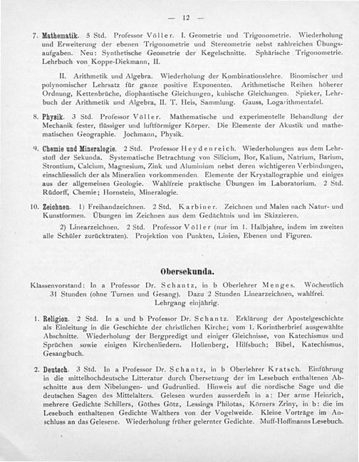 1. Religion. 2 Std. In a und b Professor Dr. Schantz. Erklärung der Apostelgeschichte als Einleitung in die Geschichte der christlichen Kirche; vom 1. Korintherbrief ausgewählte Abschnitte. Wiederholung der Bergpredigt und einiger Gleichnisse, von Katechismus und Sprüchen sowie einigen Kirchenliedern. Hollenberg, Hilfsbuch; Bibel, Katechismus, Gesangbuch.