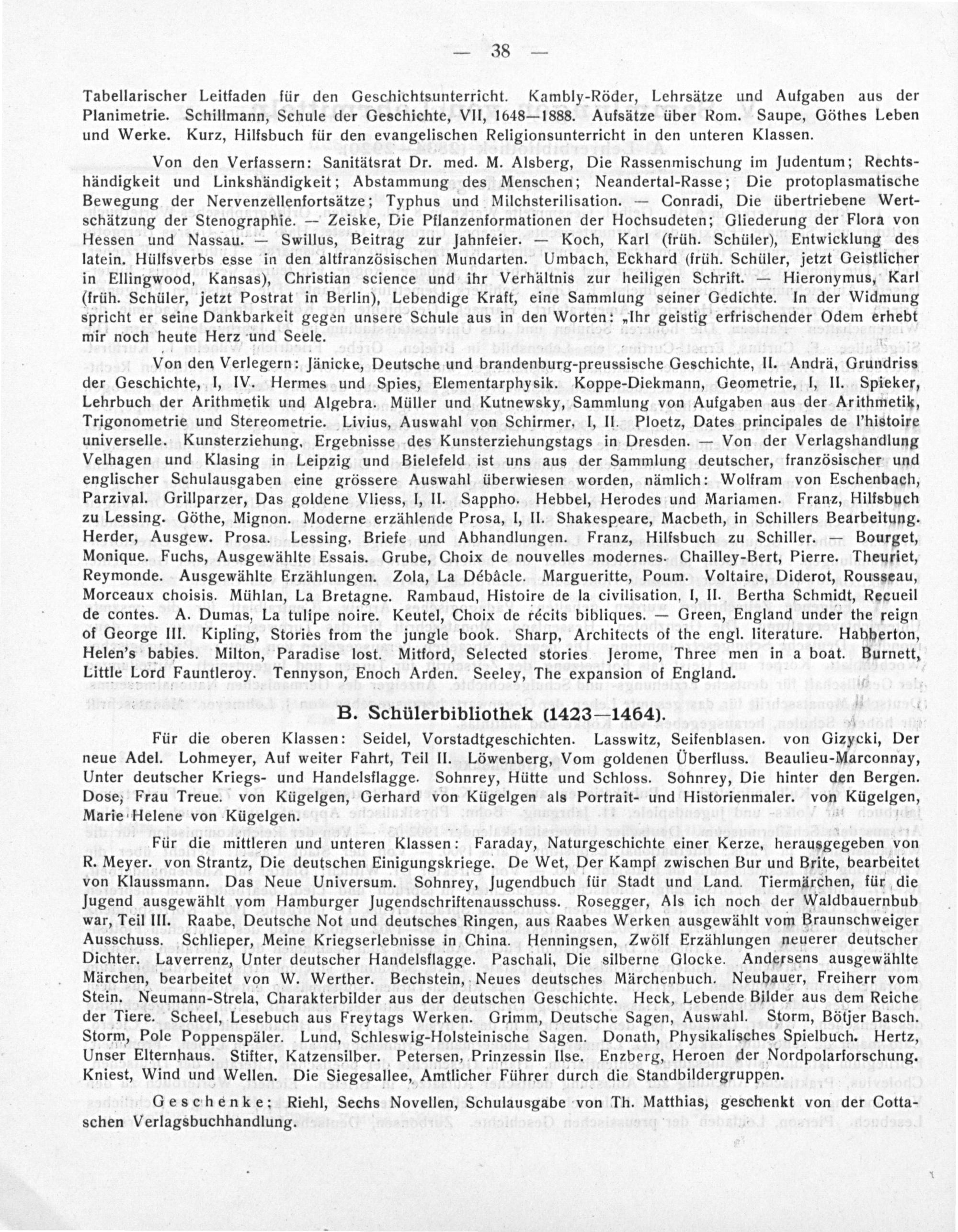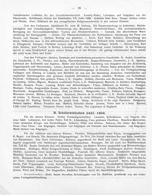 Für die mittleren und unteren Klassen: Faraday, Naturgeschichte einer Kerze, herausgegeben von R. Meyer. von Strantz, Die deutschen Einigungskriege. De Wet, Der Kampf zwischen Bur und Brite, bearbeitet von Klaussmann. Das Neue Universum. Sohnrey, jugendbuch für Stadt und Land. Tiermärchen, für die Jugend ausgewählt vom Hamburger jugendschriftenausschuss. Rosegger, Als ich noch der Waldbauernbub war, Teil III. Raabe, Deutsche Not und deutsches Ringen, aus Raabes Werken ausgewählt vom Braunschweiger Ausschuss. Schlieper, Meine Kriegserlebnisse in China. Henningsen, Zwölf Erzählungen neuerer deutscher Dichter. Laverrenz, Unter deutscher Handelsflagge. Paschali, Die silberne Glocke. Andersens ausgewählte Märchen, bearbeitet von W. Werther. Bechstein, Neues deutsches Märchenbuch. Neuhauer, Freiherr vom Stein. Neumann-Strela, Charakterbilder aus der deutschen Geschichte. Heck, Lebende Bilder aus dem Reiche der Tiere. Scheel, Lesebuch aus Freytags Werken. Grimm, Deutsche Sagen, Auswahl. Storm, Bötjer Basch. Storm, Pole Poppenspäler. Lund, Schleswig-Holsteinische Sagen. Donath, Physikalisches Spielbuch. Hertz, Unser Elternhaus. Stifter, Katzensilber. Petersen, Prinzessin Ilse. Enzberg, Heroen der Nordpolarforschung. Kniest, Wind und Wellen. Die Siegesallee, Amtlicher Führer durch die Standbildergruppen.