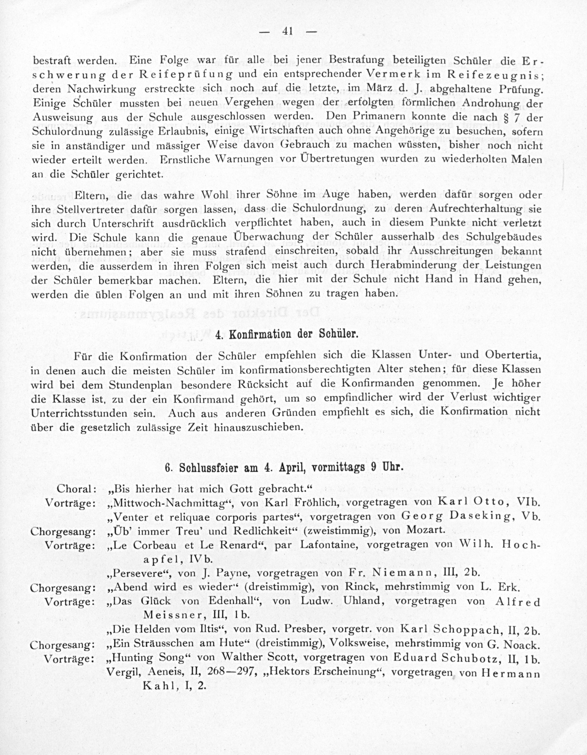 Choral:„Bis hierher hat mich Gott gebracht.“ Vorträge:„Mittwoch-Nachmittag“, von Karl Fröhlich, vorgetragen von Karl Otto, VIb. „Venter et reliquae corporis partes“, vorgetragen von Georg Daseking, Vb. Chorgesang:„Ub' immer Treu' und Redlichkeit“(zweistimmig), von Mozart. Vorträge:„Le Corbeau et Le Renard“, par Lafontaine, vorgetragen von Wilh. Hoch- apfel, IVb. „Persevere“, von J. Payne, vorgetragen von Fr. Niemann, III, 2b. Chorgesang:„Abend wird es wieder“(dreistimmig), von Rinck, mehrstimmig von L. Erk. Vorträge:„Das Glück von Edenhall“, von Ludw. Uhland, vorgetragen von Alfred Meissner, III, 1 b. „Die Helden vom IItis“, von Rud. Presber, vorgetr. von Karl Schoppach, II, 2 b. Chorgesang:„Ein Sträusschen am Hute“(dreistimmig), Volksweise, mehrstimmig von G. Noack. Vorträge:„Hunting Song“ von Walther Scott, vorgetragen von Eduard Schubotz, II, 1b. Vergil, Aeneis, II, 268— 297,„Hektors Erscheinung“, vorgetragen von Hermann Kahl, I, 2.