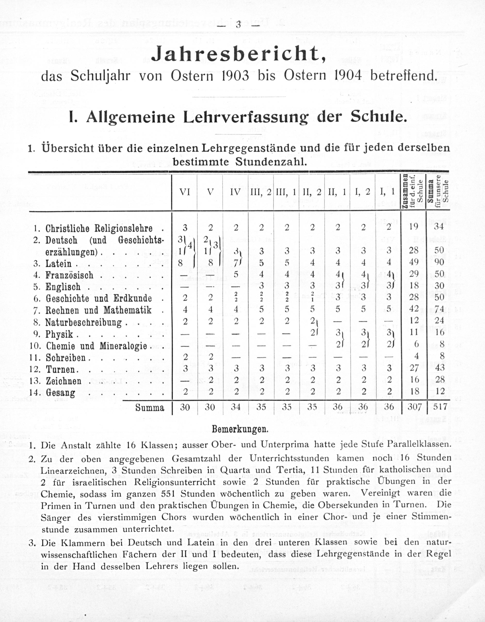 Zu der oben angegebenen Gesamtzahl der Unterrichtsstunden kamen noch 16 Stunden Linearzeichnen, 3 Stunden Schreiben in Quarta und Tertia, 11 Stunden für katholischen und 2 für israelitischen Religionsunterricht sowie 2 Stunden für praktische UÜbungen in der Chemie, sodass im ganzen 551 Stunden wöchentlich zu geben waren. Primen in Turnen und den praktischen UÜbungen in Chemie, die Obersekunden in Turnen. Die Sänger des vierstimmigen Chors wurden wöchentlich in einer Chor- und je einer Stimmen- stunde zusammen unterrichtet.