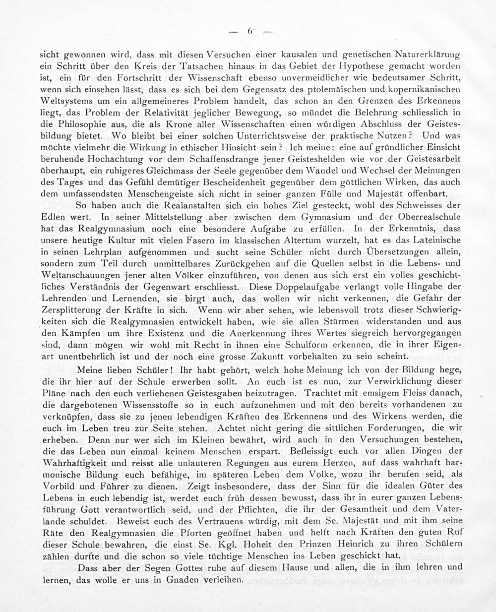 Meine lieben Schüler! Ihr habt gehört, welch hohe Meinung ich von der Bildung hege, die ihr hier auf der Schule erwerben sollt. An euch ist es nun, zur Verwirklichung dieser Pläne nach den euch verliehenen Geistesgaben beizutragen. Trachtet mit emsigem Fleiss danach, die dargebotenen Wissensstoffe so in euch aufzunehmen und mit den bereits vorhandenen zu verknüpfen, dass sie zu jenen lebendigen Kräften des Erkennens und des Wirkens werden, die euch im Leben treu zur Seite stehen. Achtet nicht gering die sittlichen Forderungen, die wir erheben. Denn nur wer sich im Kleinen bewährt, wird auch in den Versuchungen bestehen, die das Leben nun einmal keinem Menschen erspart. Befleissigt euch vor allen Dingen der Wahrhatftigkeit und reisst alle unlauteren Regungen aus eurem Herzen, auf dass wahrhaft har- monische Bildung euch befâhige, im späteren Leben dem Volke, wozu ihr berufen seid, als Vorbild und Führer zu dienen. Zeigt insbesondere, dass der Sinn für die idealen Güter des Lebens in euch lebendig ist, werdet euch früh dessen bewusst, dass ihr in eurer ganzen Lebens- führung Gott verantwortlich seid, und der Pflichten, die ihr der Gesamtheit und dem YNater- lande schuldet. Beweist euch des Vertrauens würdig, mit dem Se. Majestät und mit ihm seine Ràâte den Realgymnasien die Pforten geöffnet haben und helft nach Kraàften den guten Ruf dieser Schule bewahren, die einst Se. Kgl. Hoheit den Prinzen Heinrich zu ihren Schülern zählen durfte und die schon so viele tüchtige Menschen ins Leben geschickt hat.