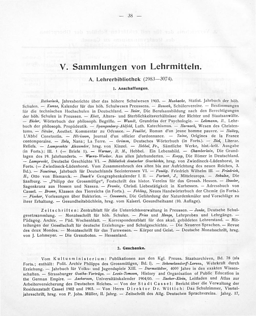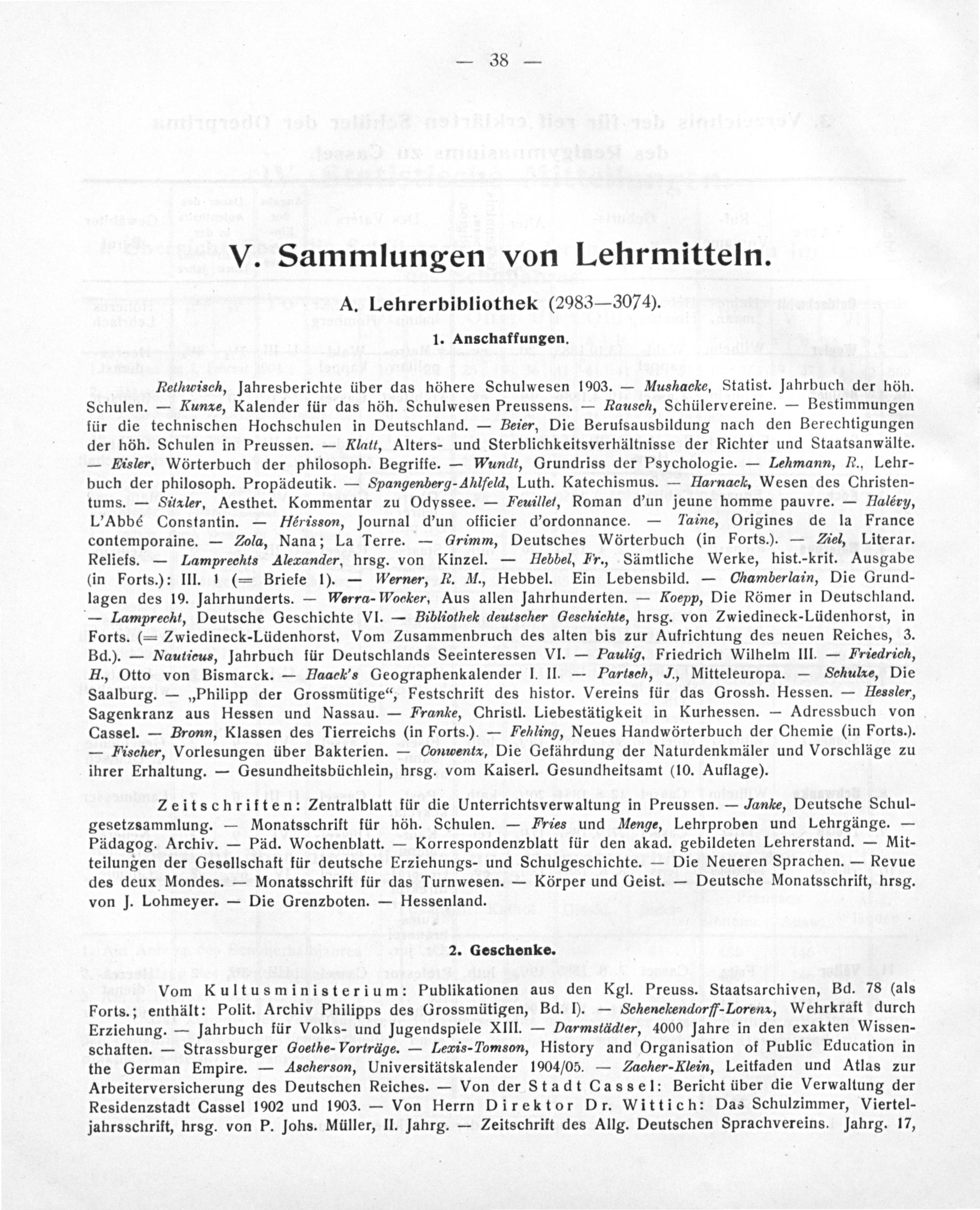 Rethwisch, Jahresberichte über das höhere Schulwesen 1903.— Mushacke, Statist. Jahrbuch der höh. Schulen.— Kunae, Kalender für das höh. Schulwesen Preussens.— Rausch, Schülervereine.— Bestimmungen für die technischen Hochschulen in Deutschland.— Beier, Die Berufsausbildung nach den Berechtigungen der höh. Schulen in Preussen.— Klatt, Alters- und Sterblichkeitsverhältnisse der Richter und Staatsanwälte. — Eisler. Wörterbuch der philosoph. Begriffe.— Wundt, Grundriss der Psychologie.— Lehmann, è., Lehr- buch der philosoph. Propädeutik.— Spangenberg-Ahlfeld, Luth. Katechismus.— Harnack, Wesen des Christen- tums.— Sitaler, Aesthet. Kommentar zu Odyssee.— Feuillef, Roman d'un jeune homme pauvre.— Haléry, L'Abbé Constantin.— Hérisson, Journal d'un officier d'ordonnance.— aine, Origines de la France contemporaine.— Zola, Nana; La Terre.— Grimm, Deutsches Wörterbuch(in Forts.).— Ziel, Literar. Reliefs.— Lamprechts Alexander, hrsg. von Kinzel.— Hebbel, Fr., Sämtliche Werke, hist.-krit. Ausgabe (in Forts.): III. 1(= Briefe 1).— Werner, R. M., Hebbel. Ein Lebensbild.— Chamberlain, Die Grund- lagen des 19. Jahrhunderts.— Werra- Woeker, Aus allen Jahrhunderten.— Koepp, Die Römer in Deutschland. — Lamprecht, Deutsche Geschichte VI.— Bibliothek deutscher Geschichte, hrsg. von Zwiedineck-Lüdenhorst, in Forts.(= Zwiedineck-Lüdenhorst, Vom Zusammenbruch des alten bis zur Aufrichtung des neuen Reiches, 3. Bd.).— Nauticus, Jahrbuch für Deutschlands Seeinteressen VI.— Paulig, Friedrich Wilhelm III.— Friedrich, H., Otto von Bismarck.— Haack'’s Geographenkalender I. II.— Partsch, J., Mitteleuropa.— Schule, Die Saalburg.—„Philipp der Grossmütige“, Festschrift des histor. Vereins für das Grossh. Hessen.— Hessler, Sagenkranz aus Hessen und Nassau.— Franke, Christl. Liebestätigkeit in Kurhessen.— Adressbuch von Cassel.— Bronn, Klassen des Tierreichs(in Forts.).— Fehling, Neues Handwörterbuch der Chemie(in Forts.). — Fischer, Vorlesungen über Bakterien.— Conwentz, Die Gefährdung der Naturdenkmäler und Vorschläge zu ihrer Erhaltung.— Gesundheitsbüchlein, hrsg. vom Kaiserl. Gesundheitsamt(10. Auflage).