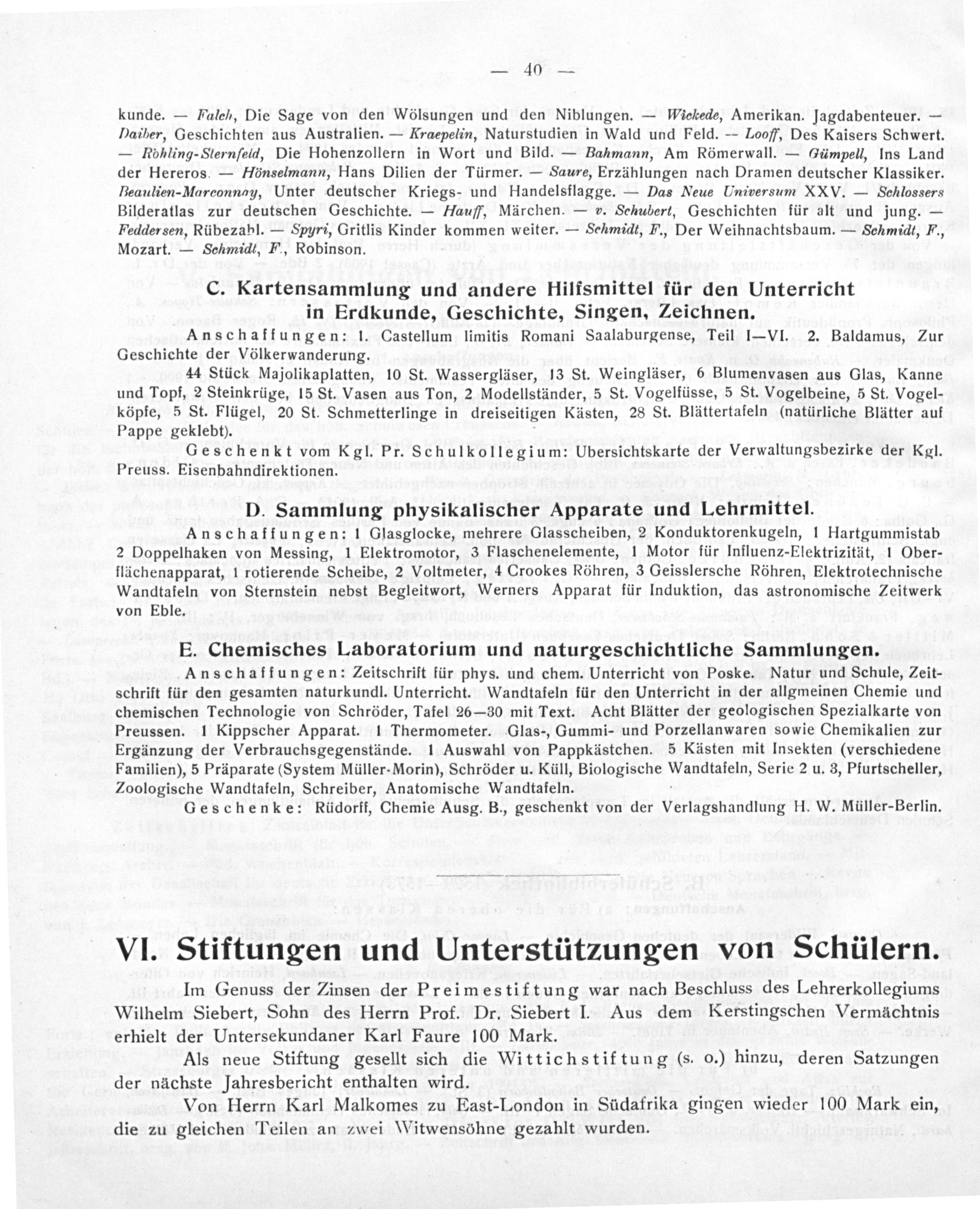 Im Genuss der Zinsen der Preimestiftung war nach Beschluss des Lehrerkollegiums Wilhelm Siebert, Sohn des Herrn Prof. Dr. Siebert J. Aus dem Kerstingschen Vermächtnis erhielt der Untersekundaner Karl Faure 100 Mark.