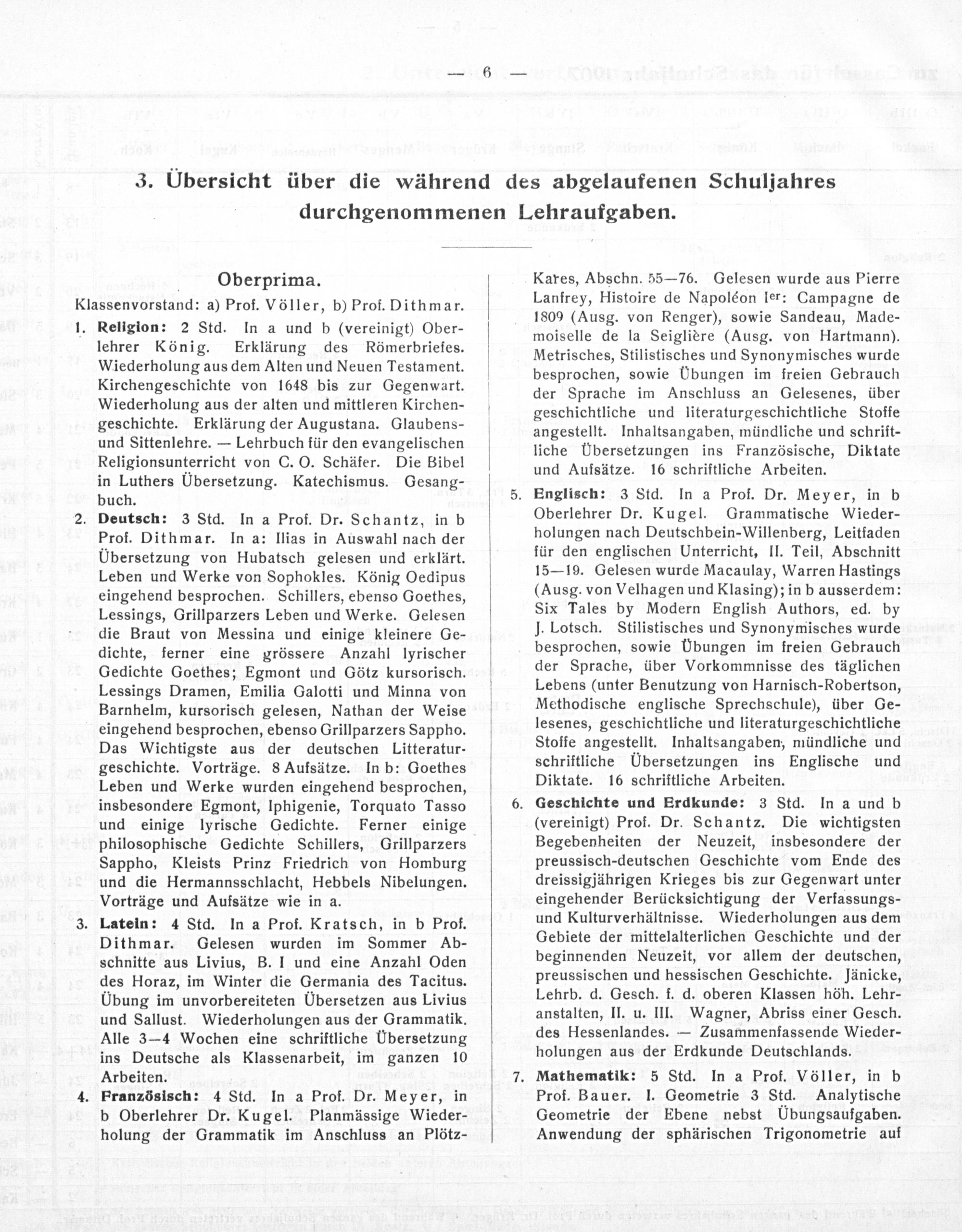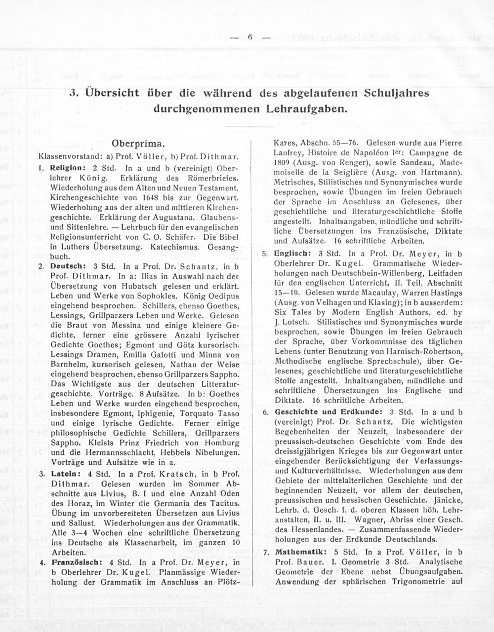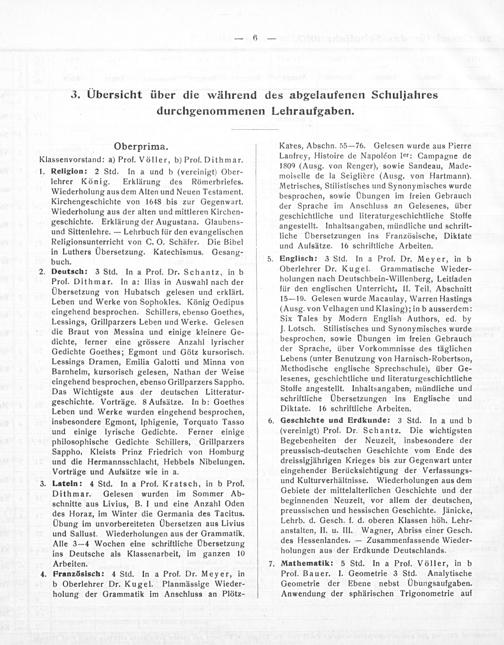 Englisch: 3 Std. In a Prof. Dr. Meyer, in b Oberlehrer Dr. Kugel. Grammatische Wieder- holungen nach Deutschbein-Willenberg, Leitfaden für den englischen Unterricht, II. Teil, Abschnitt 15— 19. Gelesen wurde Macaulay, Warren Hastings (Ausg. von Velhagen und Klasing); in b ausserdem: Six Tales by Modern English Authors, ed. by J. Lotsch. Stilistisches und Synonymisches wurde besprochen, sowie UÜbungen im freien Gebrauch der Sprache, über Vorkommnisse des täglichen Lebens(unter Benutzung von Harnisch-Robertson, Methodische englische Sprechschule), über Ge- lesenes, geschichtliche und literaturgeschichtliche Stoffe angestellt. Inhaltsangaben, mündliche und schriftliche Übersetzungen ins Englische und Diktate. 16 schriftliche Arbeiten. Geschichte und Erdkunde: 3 Std. (vereinigt) Prof. Dr. Schantz. Die wichtigsten Begebenheiten der Neuzeit, insbesondere der preussisch-deutschen Geschichte vom Ende des dreissigjährigen Krieges bis zur Gegenwart unter eingehender Berücksichtigung der Verfassungs- und Kulturverhältnisse. Wiederholungen aus dem Gebiete der mittelalterlichen Geschichte und der beginnenden Neuzeit, vor allem der deutschen, preussischen und hessischen Geschichte. Jänicke, Lehrb. d. Gesch. f. d. oberen Klassen höh. Lehr- anstalten, II. u. III. Wagner, Abriss einer Gesch. des Hessenlandes.— Zusammenfassende Wieder- holungen aus der Erdkunde Deutschlands. Mathematik: 5 Std. In a Prof. Völler, in b Prof. Bauer. I. Geometrie 3 Std. Analytische Geometrie der Ebene nebst Übungsaufgaben. Anwendung der sphärischen Trigonometrie auf