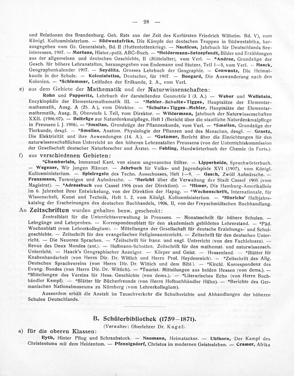 B. Schülerbibliothek(1759— 1871). .(Verwalter: Oberlehrer Dr. Kug el). für die oberen Klassen: Eyth, Hinter Pflug und Schraubstock.— Naumann, Heimatacker.— Unhthorn, Der Kampf des Christentums mit dem Heidentum.— Pfennigsdorf, Christus im modernen Geistesleben.— Cramer, Afrika