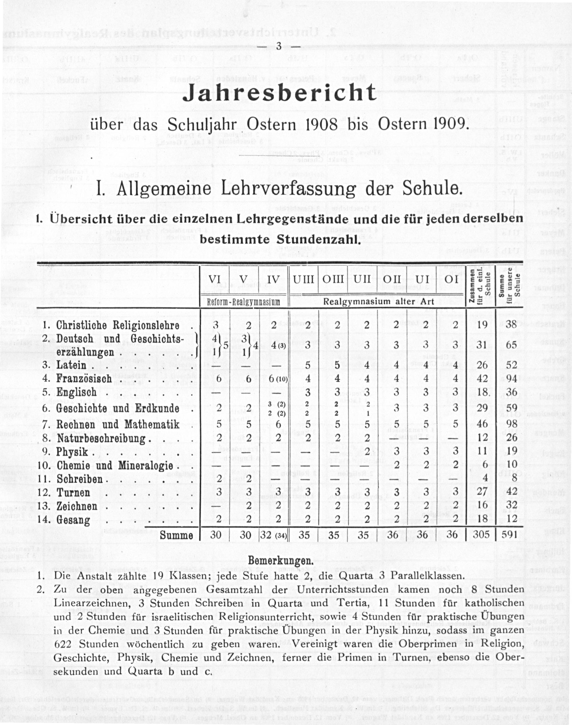 Linearzeichnen, 3 Stunden Schreiben in Quarta und Tertia, 11 Stunden für katholischen und 2 Stunden für israelitischen Religionsunterricht, sowie 4 Stunden für praktische Übungen in der Chemie und 3 Stunden für praktische Übungen in der Physik hinzu, sodass im ganzen 622 Stunden wöchentlich zu geben waren. Geschichte, Physik, Chemie und Zeichnen, ferner die Primen in Turnen, ebenso die Ober-