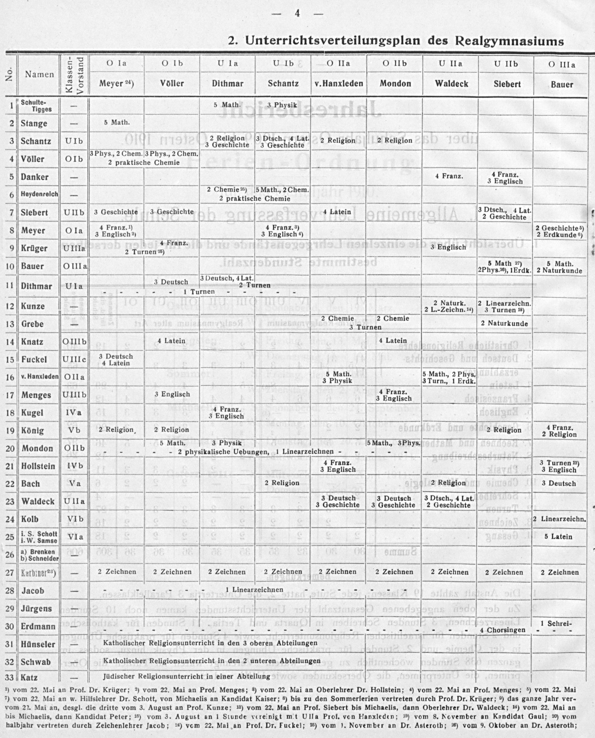 —— 5 5 O la O l b U la U Ib O IIa O IIb U IIa U IIb O IlII a 2 Namen 3 35 S 58 Neyer ²⁴) Völler Dithmar Schantz v. Hanxleden Mondon Waldeck Siebert Bauer — Schulte- 1 1 Sebndee,— 5 Math. 3 Physik 2 Stange— 5 Math. — 2 Religion 3 Dtsch., 4 Lat. 191 1 4 3 Schantz UIb 3 Geseente 3 Cearhſche 2 Religion 2 Religion 3 Phys., 2 Chem. 3 Phys., 2 Chem. 4 Völler OIb 2 praktische Chemie — 4 F. 4 Franz. 5 Danker ranz. 3 Englisch 2 Chemie ²³) 5 Math., 2 Chem.. 6 Heydenreich— 2 praktische Chemie . 3 3 Dtsch., 4 Lat. 7 Siebert UIIb s Geschichte Geschichte 4 Latein 2 Geschichfe 1 4 Franz. ¹) 4 Franz. ³) 2 Geschichte5⁵ 8Meyer[OQla 3 Puglisch 3 Englisch) 2 Eedkunde-) 4 Franz.— 4 9 Krüger UIIla 2 Turnenm) 3 Englisch 4 5 Math 2²) 5 Math. 10 Bauer OIIIa 2Phys. 26), IErdk. 2 Naturkunde 3 Deutsch, 4Lat. 1IDunmar Ula 2 Peutgehh 2 Turnen ----- 1 Turnen—---—. 2 Naturk. 2 Linearzeichn. 12 Kunze— 2 L.-Zeichn.*) 3 Turnen ¹) — 2 Chemie 2 Chemie 2 13 Grebe— 3 Turnen 2 Naturkunde 14 Knatz OMIIb 4 Latein 4 Latein 1. 3 Deutsch 15 Fuckel UIIIc 4 Lenuim 5 Math. 5 Math., 2 Phys. 16 v Hanxleden OIla 3 Physik 3 Turn., 1 Erdhk. . 4 Franz. 17 Menges UIIIb 3 Englisch 3 Englisch 4 Franz. 18 Kugel IVa 3 Englisch 8„ ₰. i 4 Franz. 19 König Vb 2 Religion, 2 Religion 2 Religion 2 Religion 5 Math. 3 Physik 5 Math., 3 Phys. 20 Mondon OlIlb- 2 physikalische Uebungen, 1 Linearzeichne-. 4 Franz. 1 3 Turnen ¹2 21 Hollstein IVb 3 Englisch— 3 Pngltach) 22 Bach Va 2 Religion 2 Religion 3 Deutsch „2 3 Deutsch 3 Deutsch 3 Dtsch., 4 Lat. 23 Waldeck UIlla Geschichte 3 Geschichte 2 Geschichte. 24 Kolb VIb 2 Linearzeichn. 25 1. s. Scnott 25 1. W. Samse VlIa 5 Latein a) Brenken 26 b) Schneldes— 27 Karbiner²²)— 2 Zeichnen 2 Zeichnen 2 Zeichnen 2 Zeichnen 2 Zeichnen 2 Zeich 2 Zeichnen 2 Zeichnen 2 Zeichnen 28 Jacob—-..— 1 Linearzeichnen-== 2 29 Jürgens— — 1 Schrei- 30 Erdmann—-...=.........„... 4 cChorsingen... 31 Hünseler— Katholischer Religionsunterricht in den 3 oberen Abteilungen 32 Schwab— Katholischer Religionsunterricht in den 2 unteren Abteilungen 33 Katz— Jüdischer Religionsunterricht in einer Abteilung