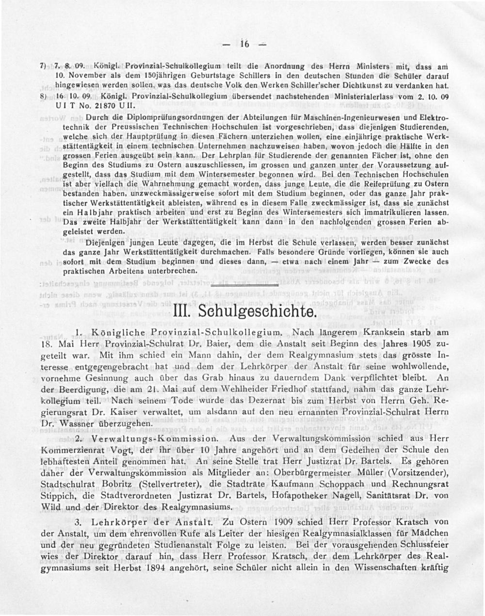 7) 7. 8. 09. Königl. Provinzial-Schulkollegium teilt die Anordnung des Herrn Ministers mit, dass am 10. November als dem 150jährigen Geburtstage Schillers in den deutschen Stunden die Schüler darauf hingewiesen werden sollen, was das deutsche Volk den Werken Schiller'scher Dichtkunst zu verdanken hat.
