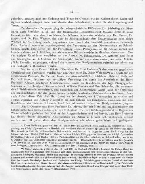 3 Erust Hollstein, geboren den 16. Januar 1880 zu Wanfried, Kreis Eschwege, bestand die Reife- prüfung am Königl. Gymnasium zu Hersfeld und studierte alsdann neuere Sprachen an der Universität Halle. Hier erwarb er 1901 die philosophische Doktorwürde und bestand im folgenden Jahre die Prüfung für das höhere Lehramt. Herbst 1902 trat er alsdann in das Königl. Pädagogische Seminar am Königl. Gymnasium zu Weilburg ein und ging Herbst 1903 als Probekandidat an die Oberrealschule zu Schmalkalden, wo er am 1. Oktober 1904 als Oberlehrer endgültig angestellt wurde.— Druckschriften: 1. Verhältnis von Ben Jonson's „The devil is on ass“ und John Wilson's„Belphegor or the marriage of the devil“ zu Machiavelli's Novelle vom Belfagor,(Dissertation) 1901; 2. Geschichte der Stadt Wantried, 1908.