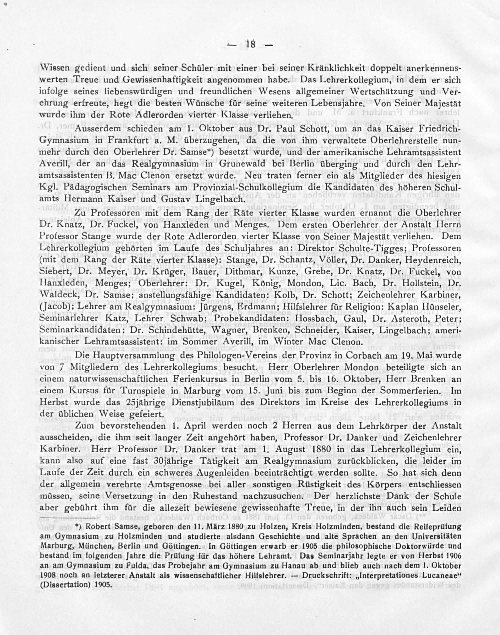 Ausserdem schieden am l. Oktober aus Dr. Paul Schott, um an das Kaiser Friedrich- Gymnasium in Frankfurt a. M. überzugehen, da die von ihm verwaltete Oberlehrerstelle nun- mehr durch den Oberlehrer Dr. Samse*) besetzt wurde, und der amerikanische Lehramtsassistent Averill, der an das Realgymnasium in Grunewald bei Berlin überging und durch den Lehr- amtsassistenten B. Mac Clenon ersetzt wurde. Neu traten ferner ein als Mitglieder des hiesigen Kgl. Päâdagogischen Seminars am Provinzial-Schulkollegium die Kandidaten des höheren Schul- amts Hermann Kaiser und Gustav Lingelbach.