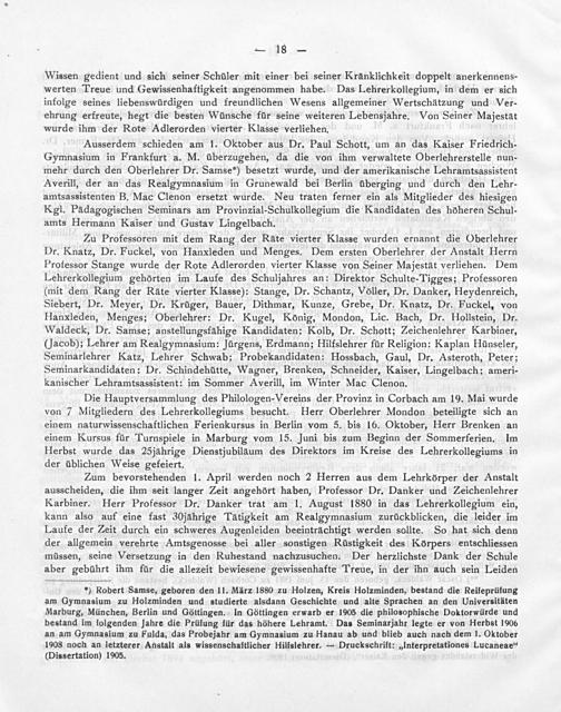 *) Robert Samse, geboren den 11. März 1880 zu Holzen, Kreis Holzminden, bestand die Reifeprüfung am Gymnasium zu Holzminden und studierte alsdann Geschichte und alte Sprachen an den Universitäten Marburg, München, Berlin und Göttingen. In Göttingen erwarb er 1905 die philosophische Doktorwürde und bestand im folgenden Jahre die Prüfung für das höhere Lehramt. Das Seminarjahr legte er von Herbst 1906 an am Gymnasium zu Fulda, das Probejahr am Gymnasium zu Hanau ab und blieb auch nach dem 1. Oktober 1908 noch an letzterer Anstalt als wissenschaftlicher Hilfslehrer.— Druckschrift:„Interpretationes Lucaneae“ (Dissertation) 1905.
