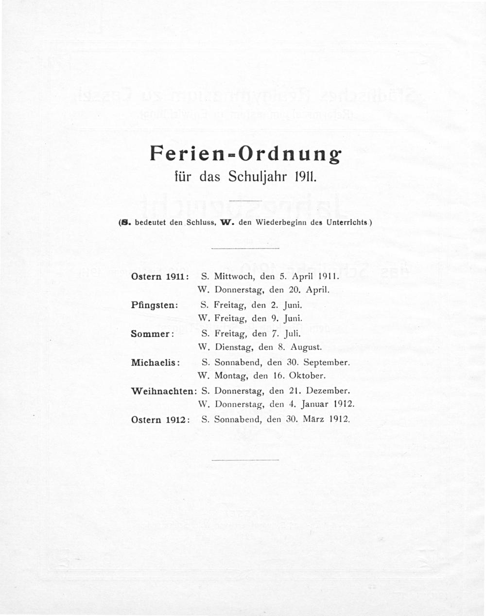(S. bedeutet den Schluss, W. den Wiederbeginn des Unterrichts)