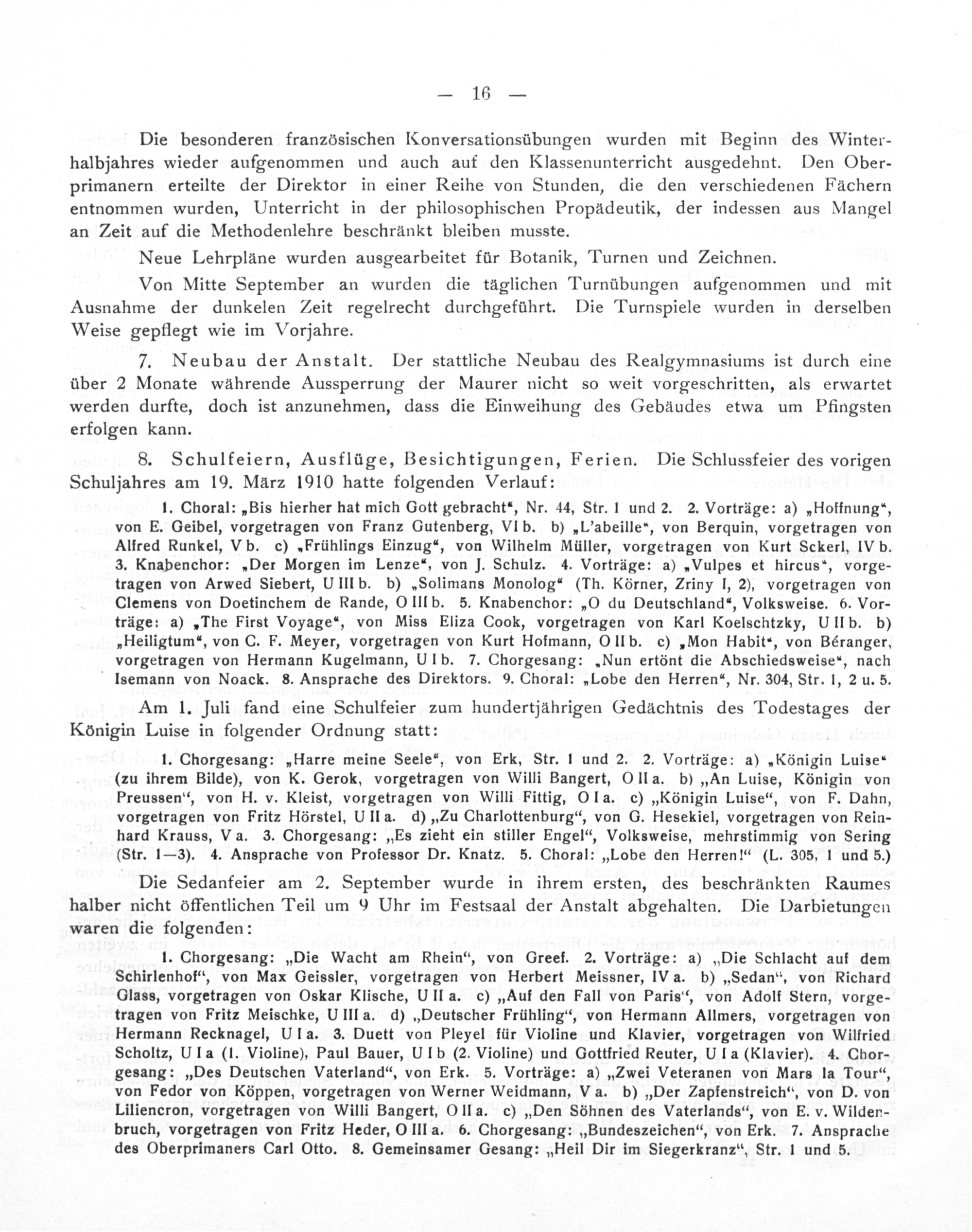 1. Chorgesang:„Harre meine Seele“, von Erk, Str. l und 2. 2. Vorträge: a)„Königin Luise“ (zu ihrem Bilde), von K. Gerok, vorgetragen von Willi Bangert, OIla. b)„An Luise, Königin von Preussen“, von H. v. Kleist, vorgetragen von Willi Fittig, Ola. c)„Königin Luise“, von F. Dahn, vorgetragen von Fritz Hörstel, UIla. d)„Zu Charlottenburg“, von G. Hesekiel, vorgetragen von Rein- hard Krauss, Va. 3. Chorgesang:„Es zieht ein stiller Engel“, Volksweise, mehrstimmig von Sering (Str. 1— 3). 4. Ansprache von Professor Dr. Knatz. 5. Choral:„Lobe den Herren!“(L. 305, 1 und 5.)