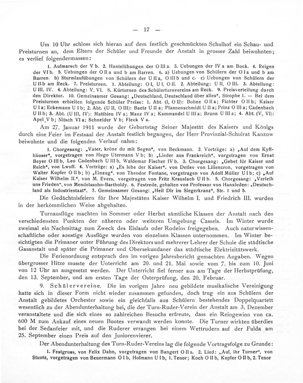 9. Schülervereine. Die im vorigen Jahre neu gebildete musikalische Vereinigung hatte sich in dieser Form nicht wieder zusammen gefunden, doch trug ein aus Schülern der Anstalt gebildetes Orchester sowie ein gleichfalls aus Schülern bestehendes Doppelquartett wesentlich zu der Abendunterhaltung bei, die der Turn-Ruder-Verein der Anstalt am 3. Dezember veranstaltete und die sich eines so zahlreichen Besuchs erfreute, dass ein Reingewinn von ca. 600 M zum Ankauf eines neuen Bootes verwandt werden konnte. Die Turner wirkten überdies bei der Sedanfeier mit, und die Ruderer errangen bei einem Wettrudern auf der Fulda am 25. September einen Preis auf den Juniorenvierer.