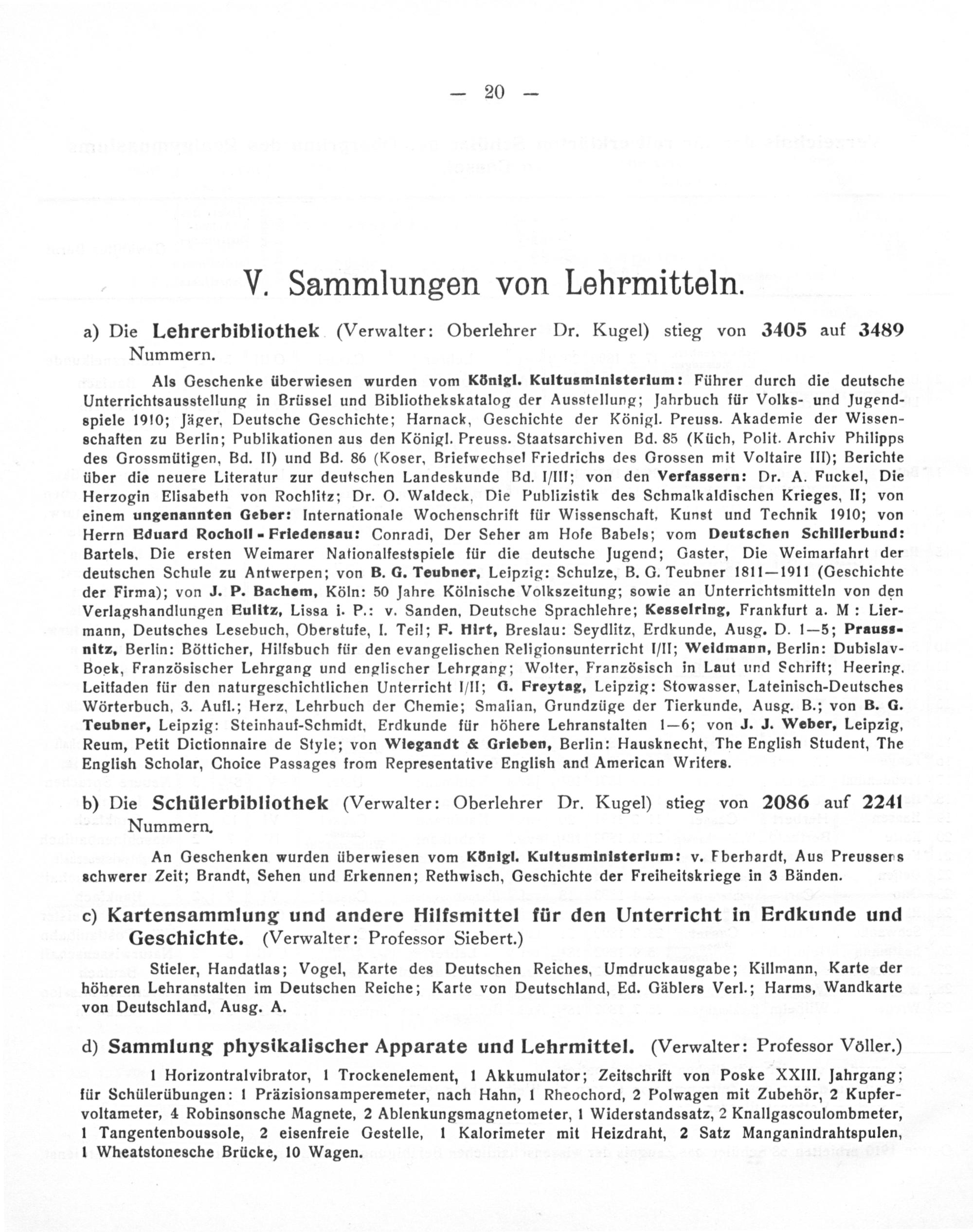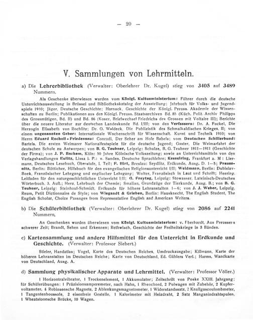 a) Die Lehrerbibliothek(Verwalter: Oberlehrer Dr. Kugel) stieg von 3405 auf 34890 Nummern.