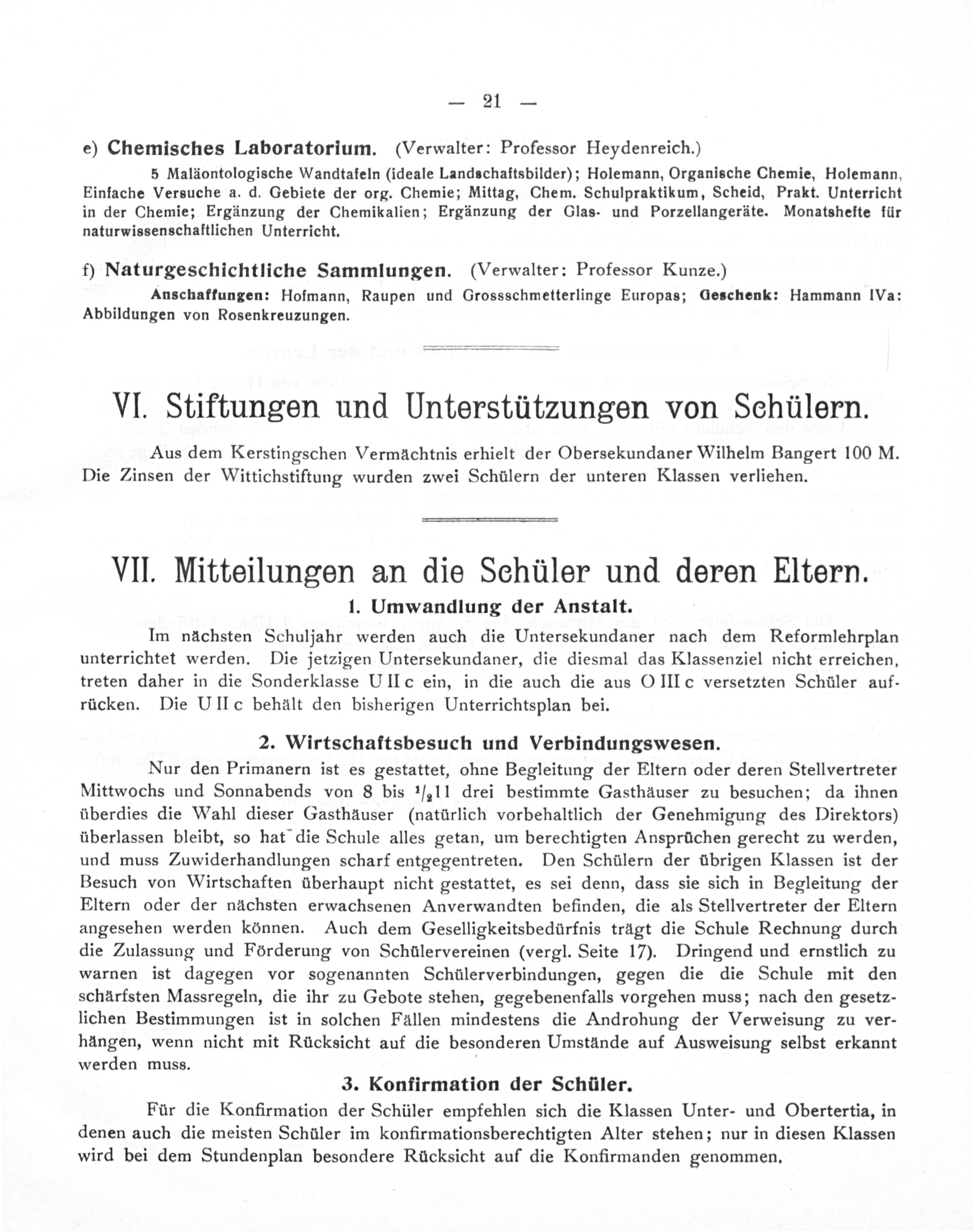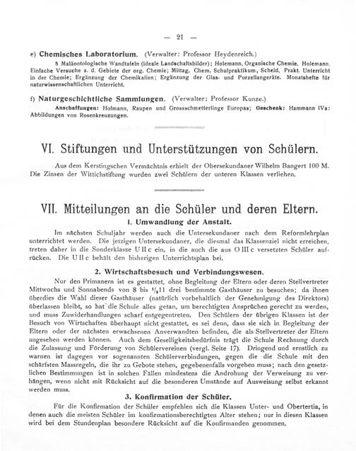 Aus dem Kerstingschen Vermächtnis erhielt der Obersekundaner Wilhelm Bangert 100 M. Die Zinsen der Wittichstiftung wurden zwei Schülern der unteren Klassen verliehen.