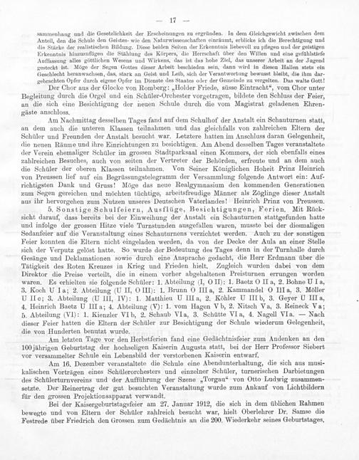 Bei der Kaisergeburtstagsfeier am 27. Januar 1912, die sich in dem üblichen Rahmen bewegte und von Eltern der Schüler zahlreich besucht war, hielt Oberlehrer Dr. Samse die Festrede über Friedrich den Grossen zum Gedächtnis an die 200. Wiederkehr seines Geburtstages.