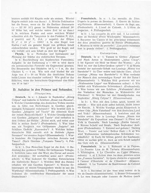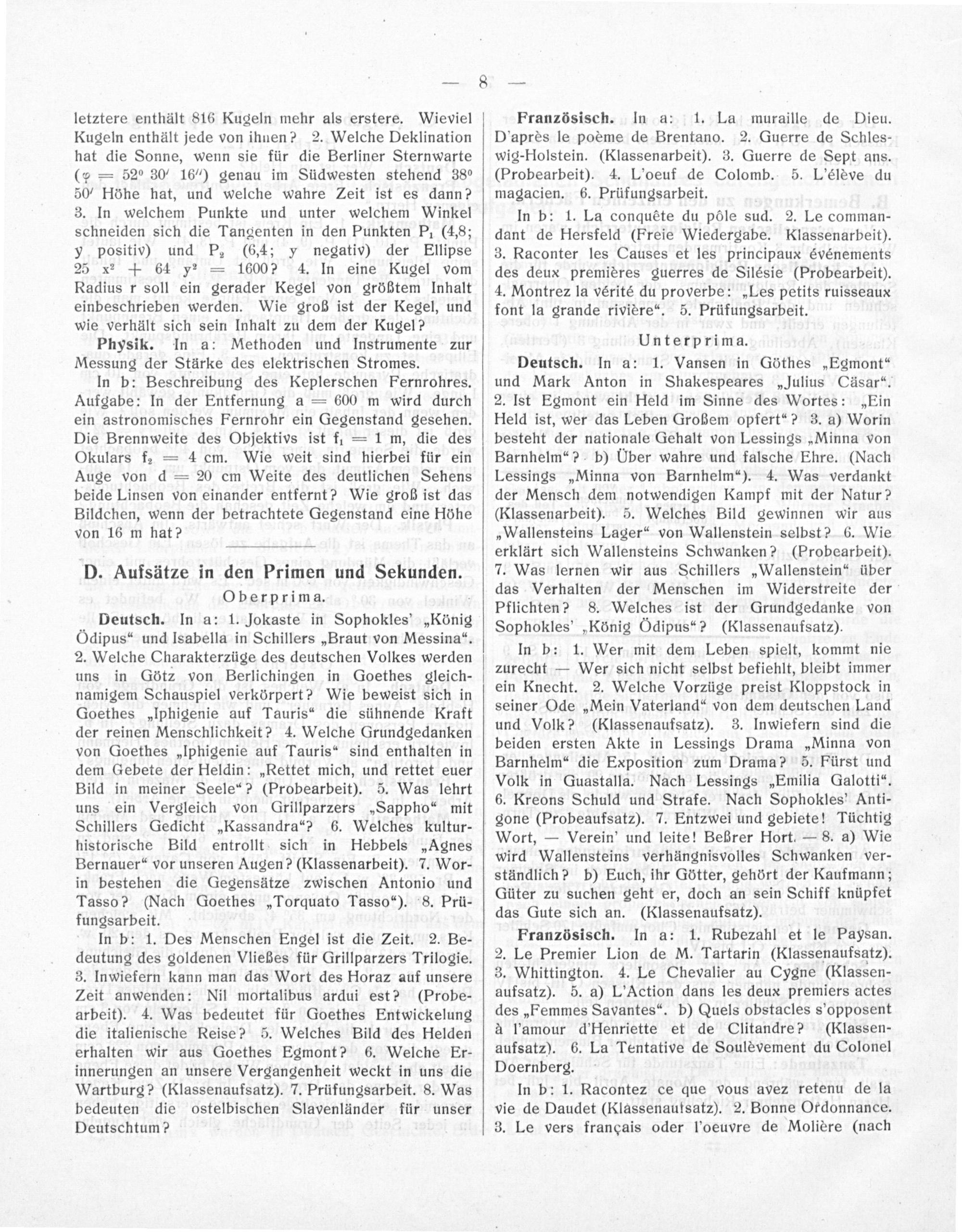 Deutsch. In a: 1. Vansen in Göthes„Egmont“ und Mark Anton in Shakespeares„Julius Cäsar“.“ 2. Ist Egmont ein Held im Sinne des Wortes:„Ein Held ist, wer das Leben Großem opfert“? 3. a) Worin besteht der nationale Gehalt von Lessings„Minna von Barnhelm“? b) UÜber wahre und falsche Ehre.(Nach Lessings„Minna von Barnhelm“). 4. Was verdankt der Mensch dem notwendigen Kampf mit der Natur? (Klassenarbeit). 5. Welches Bild gewinnen wir aus „Wallensteins Lager“ von Wallenstein selbst? 6. Wie erklärt sich Wallensteins Schwanken?(Probearbeit). 7. Was lernen wir aus Schillers„Wallenstein“ über das Verhalten der Menschen im Wicderstreite der Pflichten? 8. Welches ist der Grundgedanke von Sophokles'„König dipus“?(Klassenaufsatz).
