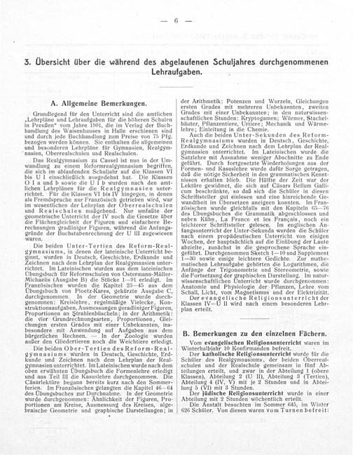 der Arithmetik: Potenzen und Wurzeln, Gleichungen ersten Grades mit mehreren Unbekannten, zweiten Grades mit einer Unbekannten; in den naturwissen- schaftlichen Stunden: Kryptogamen; Würmer, Stachel- häuter, Pflanzentiere, Urtiere; Mechanik und Wärme- lehre; Einleitung in die Chemie.