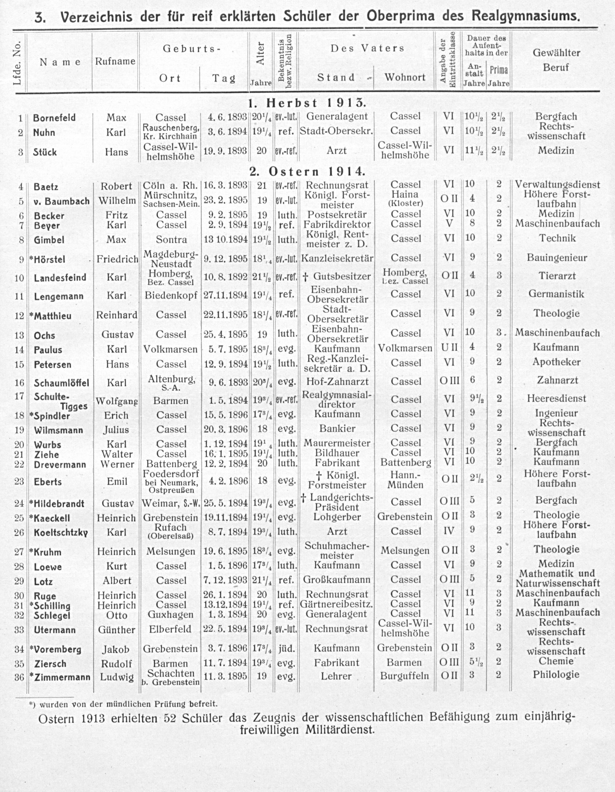6— V 4 2.5 ⸗„ 8Dauer des 2 V Geburts- 5 58 Des Vaters(3 3 atesim dor Gewählter Name Rufname 2 3 23 58 0 I I* Stand Wonnort 8 aait Flims Beruf —₰ rt 2 8 Jahre 8 an ohnort 2 Jahre Jahre 1. Herbst 1 913. 1 Bornefeld Max Cassel 4. 6. 1893 20 7aſek-li Generalagent Cassel VI 10 ½] 2 ½ Bergfach Rauschenberg, Rechts- 2 Nuhn Karl 5 iregiats 3. 6. 1894to ref. Stadt-Obersekr.— Seer V VI 10 ½ 2 ½¼ wi ee aft , assel-Wil- assel-Wil- 1— 3 V Stück Hans nelmshöhe 19. 9. 1893 20 et-r. Arzt helmshöhe VI 11 ½ 2 ½ V Medizin 2. Ostern 1914. 4 V Baetz Robert Dn 4 3 16. 3. 1893] 21. f der Rechnungsrat Laßdel VI 10 2 Verwaltungsdienst . ürschnitz, 7 Königl. Forst- aina Höh F 2 5 v. Baumbach Wilhelm Jalnden ictn. 23.2.1895 19 drelut, 5nel kep s(klster) OII 4 2 Lhert Forft 6 Becker Fritz Cassel 9. 2. 1895 19 luth. Postsekretär Cassel VI 10 2 Medizin 7 Bever Karl Cassel 2. 9. 1894 19 ½ ref. Fabrikdirektor Cassel V 8 2 Maschinenbaufach 8 G6imbel Max Sontra 13 10.1894 19 ½(luth. hönigl. Fent, Cassel VI 10 2 Technik 9*Hörstel Friedrich Aedebura. 9. 12. 1895 18¹ſey.-Jut,. Kanzleisekretär, Cassel VI 9 2 Bauingenieur 10 Landesfeind Karl Plomberg 10. 8. 1892 21 ½ ſev⸗Tef.—† Gutsbesitzer llomberg OII 4 3 Tierarzt 11 Lengemann Karl Biedenkopf 27.11.1894 19 ⅛ ref. EEisenbanna. Cassel VI 10 2 Germanistik 12*Matthieu Reinhardſ Cassel(22.11.1895 18 ¼ 5 Opsrtasretur Cassel VI 9 2 Theologie 13 Ochs Gustav Cassel 25.4. 1895 19 luth.(isenhane, Cassel VI 10 3. Maschinenbaufach 14 Paulus Karl Volkmarsen 5. 7. 1895 18 ⅜ evg. Kaufmann Volkmarsen UII 4 2 Kaufmann 15 Petersen Hans Cassel 12. 9. 1894 19 ½ luth. Peg⸗Kanelole Cassel V VI 9 2 Apotheker 16 Schaumlöffel Karl Altenhune. 9. 6. 1893 20 ¾ evg. Hof-Zahnarzt Cassel OIII6 2 Zahnarzt 17 Sohatee⸗ gges Wolfgang Barmen 1.,5. 1894 19 ¾ ev-fef. Pealsymmasial- Cassel VI 9 ½ 2 Heeresdienst 18*Spindler Erich Cassel 15. 5. 1896 17 ¾ evg. Kaufmann Cassel VI 9 2 Ingenieur 19 Wilmsmann Julius Cassel(20. 3. 1896 18 evg. Bankier Cassel VI 9 2 wlcohtde. 20 Warbs Karl Cassel 1. 12. 1894 191 luth. Maurermeister Cassel VI 9 2 Bergfach 21 Ziehe Walter Cassel 16. 1. 1895 19 ¼ luth. Bildhauer Cassel VI 10 2 Kaufmann 22 Drevermann Werner Battenberg 12. 2. 1894 20 luth. Fabrikant Battenberg VI 10 2 Kaufmann i PFoedersdorf † Königl. Hann.- 21 Höhere Forst- 23 Eberts Emil V de dleucharhe 4. 2. 1896 18 evg. Forstmeister Münden OII 2 ½ 2 laufbahn 24 Hildebrandt Gustav Weimar, 8.-W. 25. 5. 1894 19 ⅜ evg. t Parelgarichts⸗ Cassel OIII 5 2 Bergfach 25*Kaeckell Heinrich Grebenstein 19.11.1894 19 ⅓ evg. Lohgerber Grebenstein OII3 2 Theologie 26 Koeitschteky Karl(Rufach.) S. 7. 1894 19% luth. Arzt Cassel Ivo 2 llöhere morst⸗ 27*Kruhm Heinrich, Melsungen 19.6.1895 18 4 evg. Schuhmacher- Melsungen Oll 3 2²2 Theologie 28 Loewe Kurt Cassel 1. 5. 1896 17 ¾ luth. Kaufmann Cassel VI 9 2 Medizin 29 Lotz Albert Cassel 7.12. 1893 21 ¼ ref. Großkaufmann Cassel OIII5 2 Muthemati und. 30 Ruge Heinrich Cassel 26. 1. 1894] 20 luth. Rechnungsrat Cassel VI 11 3 Maschinenbaufach 31*Schilling Heinrich Cassel 13.12.1894 19 ¼ ref. Gärtnereibesitz. Cassel VI 9 2 Kaufmann 32 Schlegel Otto Guxhagen 1. 3. 1894 20 ſevg. Generalagent Cassel VI 11 3 Maschinenbaufach 33 Utermann Günther Elberfeid 22.5. 1894 19 ⁄ er-llt) Rechnungsrat GassehMiil- VI io 3 wiKechtäaft 34*Voremberg Jakob Grebenstein 3. 7. 1896 17 ¾ jüd. Kaufmann Grebenstein OII 3 2 w Ksehtse e 35 TZiersch Rudolf Barmen 11. 7. 1894 19 ¾ evg. Fabrikant Barmen OIII 5 ½ 2 Chemie 36*Zimmermann Ludwig Sohachtenn 11. 3. 1895 19 evg. Lehrer Burguffeln O II3 2 Philologie 4