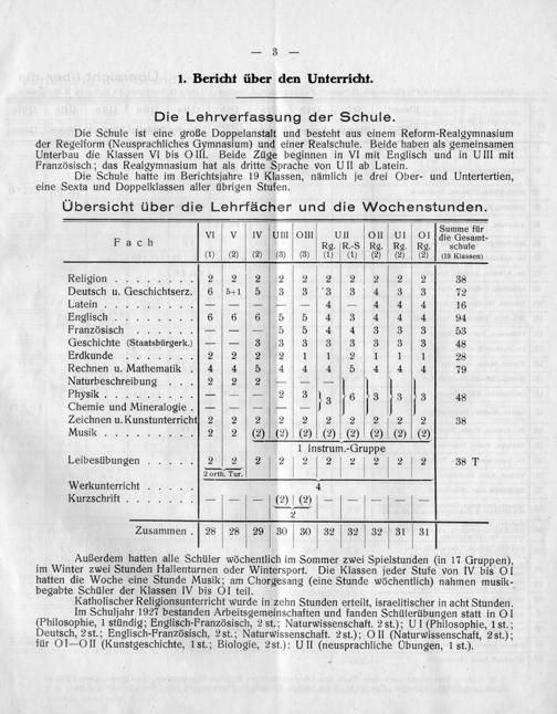 Im Schuljahr 1927 bestanden Arbeitsgemeinschaften und fanden Schülerübungen statt in Ol (Philosophie, 1 stündig; Englisch-Französisch, 2 st., Naturwissenschaft. 2 st.); UI(Philosophie, 1 st.; Deutsch, 28t.; Englisch-Französisch, 28t.; Naturwissenschaft. 2st.); O II(Naturwissenschaft, 28t.); für O—OII(Kunstgeschichte, 1st.; Biologie, 2st.): UII(neusprachliche UÜbungen, 1 st.).