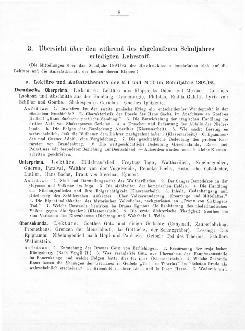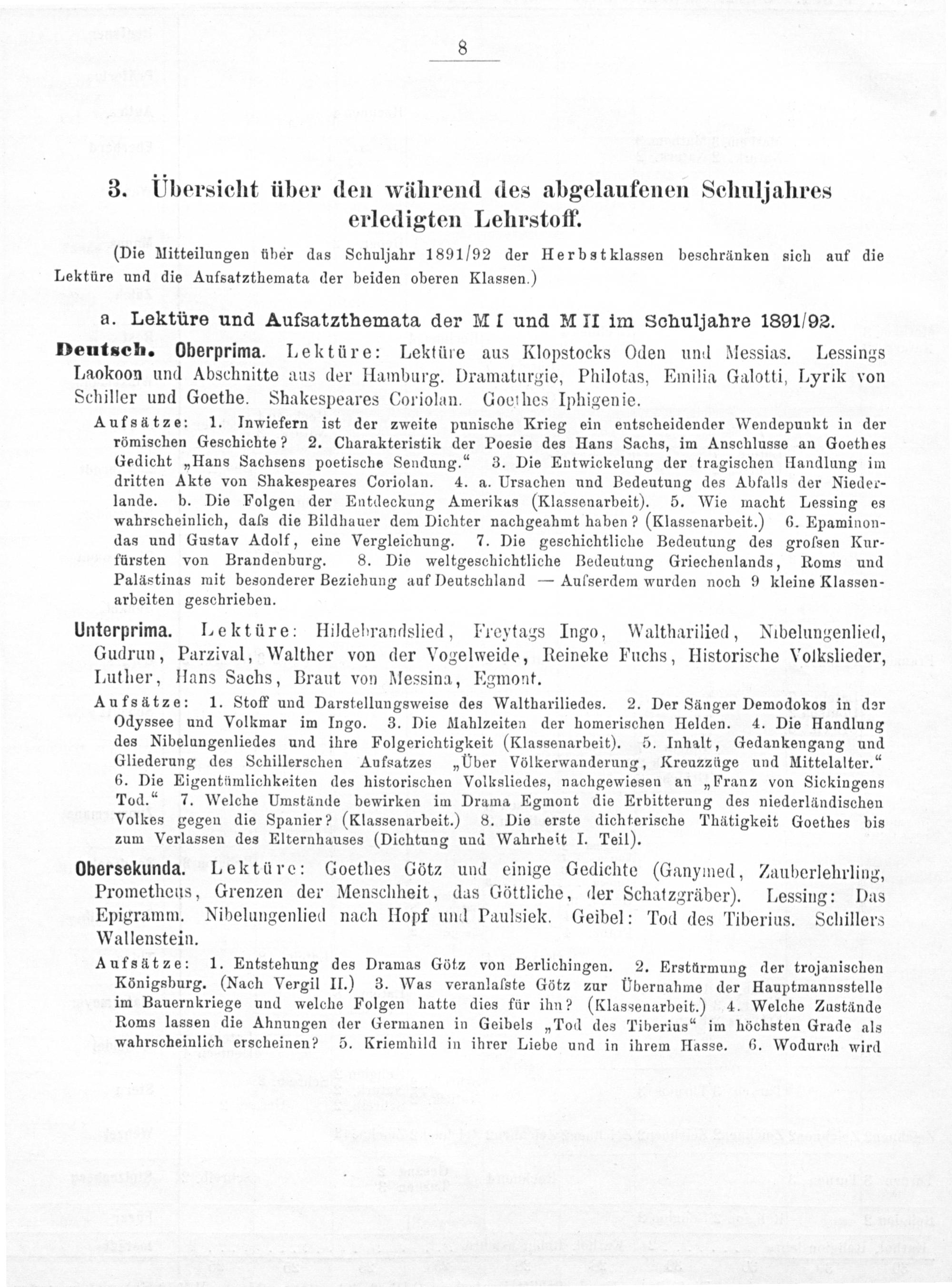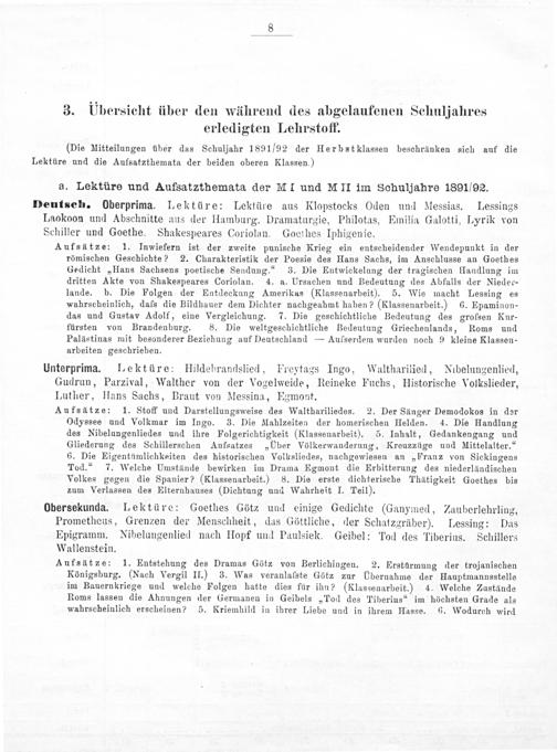 Aufsätze: 1. Stoff und Darstellungsweise des Walthariliedes. 2. Der Säünger Demodokos in der Odyssee und Volkmar im Ingo. 3. Die Mahlzeiten der homerischen Helden. 4. Die Handlung des Nibelungenliedes und ihre Folgerichtigkeit(Klassenarbeit). 5. Inhalt, Gedankengang und Gliederung des Schillerschen Aufsatzes„Uber Völkerwanderung, Kreuzzüge und Mittelalter.“ 6. Die Eigentümlichkeiten des historischen Volksliedes, nachgewiesen an„Franz von Sickingens Tod.“ 7. Welche Umstände bewirken im Drama Egmont die Erbitterung des niederländischen Volkes gegen die Spanier?(Klassenarbeit.) 8. Die erste dichterische Thätigkeit Goethes bis zum Verlassen des Elternhauses(Dichtung und Wahrheit I. Teil).