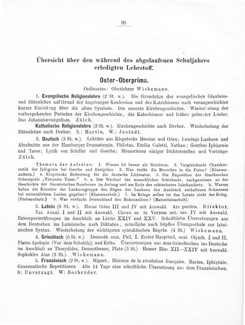 Oster-Oberprima. Ordinarius: Oberlehrer Wiskemann.