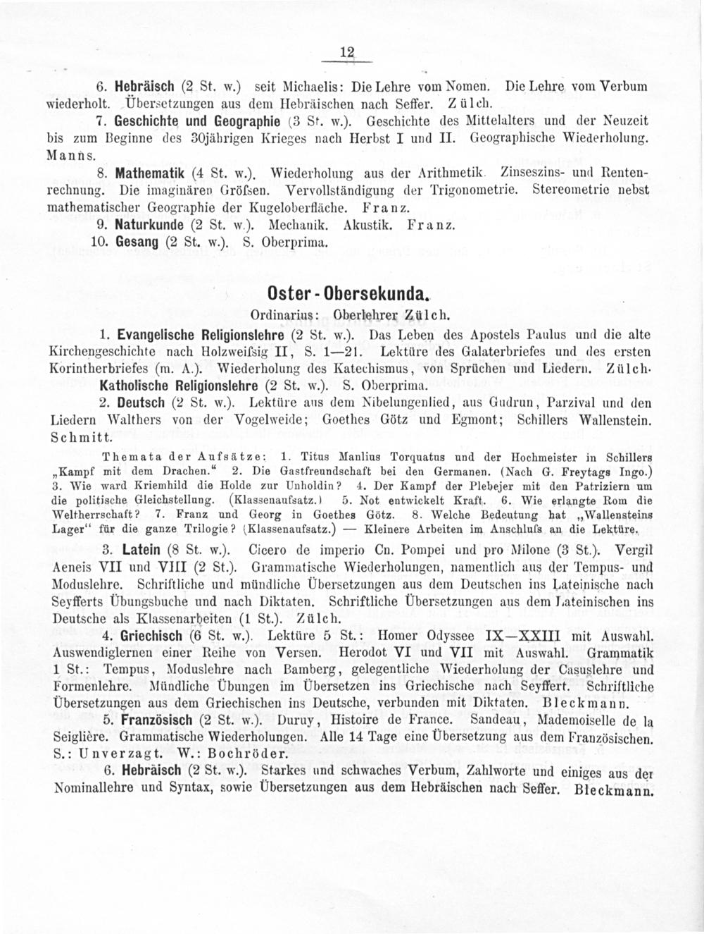 3. Latein(8 St. w.). Cicero de imperio Cn. Pompei und pro Milone(3 St.). Vergil Aeneis VII und VIII(2 St.). Grammatische Wiederholungen, namentlich aus der Tempus- und Moduslehre. Schriftliche und mündliche UÜbersetzungen aus dem Deutschen ins Lateinische nach Seyfferts UÜbungsbuche und nach Diktaten. Schriftliche Übersetzungen aus dem Jateinischen ins Deutsche als Klassenarbeiten(1 St.). Zülch.