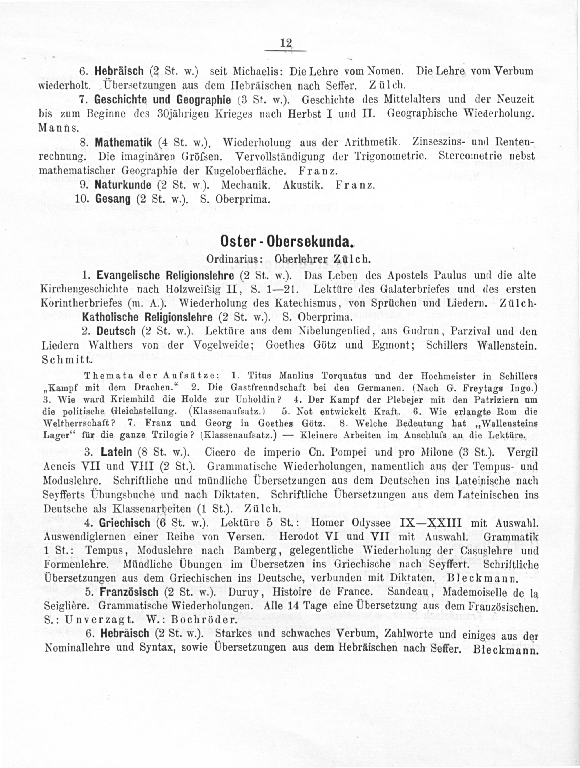 2. Deutsch(2 St. w.). Lektüre aus dem Nibelungenlied, aus Gudrun, Parzival und den Liedern Walthers von der Vogelweide; Goethes Götz und Egmont; Schillers Wallenstein. Schmitt.