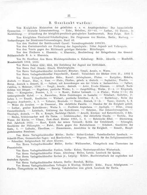 Von Herrn Verlagsbuchhändler Hühn, Kassel: Aristophanes, Plutus.— Euripides, Hekuba, deutsch.— Homer, Ilias, v. Voss— Plato, Phädon, griech. u. deutsch.— Sophokles, Trachin.— Horaz, deutsch v. Ernesti, II.— Saͤllust, mit Anmerkungen aus der Schule v. Aschersleben.— Sallust, Catilina, v. Meissner, 1790.— Vergil, Aeneis, deutsch.— Aster, Ernste Stimmen.— Althoff, Nach- richten von Bürger.— Hagedorn, poetische Werke, 1.— Jung-Stilling, Werke, 2— 4.— Klopstock, Oden.— Kosegarten, Poesien, 1, 2.— v. Moser, Doktor Leitemit.— v. Platen, Werke 1—5; die verhängnisvolle Gabel.— v. Racowitza, Meine Beziehungen zu Lassalle.— Schubart, Gedichte, 2; Leben 1.— Traudt, Bonifacius.— Wieland, poetische Schriften, 2, 3.— Barthélemy, Reise des jüngeren Anacharsis, 4, 5.— Voltaire, Henriade.— Dante, deutsch, 1— 3.— Tasso, deutsch, 1, 2. — Wigder die Jesuiten.— de Pressensé, Die christliche Familie.— Stunden für die Ewigkeit gelebt. — Luther, groſser Katechismus; Werke 5.— Confessis Augustana.— Apologie.— Ditze, evang. Concordienbuch.— Leimbach, Erklärung des Katechismus.— Osterzee, Das Johannisevangelium.— Theologie, deutsch.— Th. v. Kempis, Nachfolge Christi.— Arnold, Kirchen- und Ketzerhistorie, 2 Bde. — Henke, Schleiermacher und die Union.— Schleiermacher, Der christliche Glaube.— Trebitz, Das Wesen der Kirche.— Vilmar, Past.-theol. Blätter 1862, 5, 6.— Hebräische Bibel.— Diesterweg, Pad. Jahrbuch 1852.— Kant, Kritik der reinen Vernunft; Kritik der Urteilskraft.— Schwegler, Geschichte der Philosophie.— Fabri, Briefe gegen den Materialismus.— Schubert, Geschichte der Seele, 1.— Leibnitz, Theodicee.— Zimmermann, Aussichten in die Ewigkeit.— Remelé, Haupt- gesteinsarten Preuſsens.