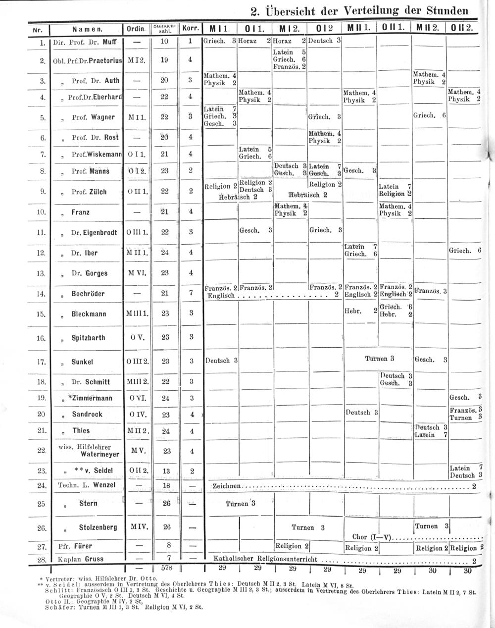 — Nr. Namen. JOrdin.]Swenn[Korr.] MLI. L. OLI..MI.2. 012[uI 1..OlL. Mn2. 0112. 1. Dir. Prof. Dr. Muff— 10 1[Griech. 3 Horaz 2ſHoraz 2/Deutsch 3 Latein 5 2.] Obl. Prf. Dr. Praetoriusſ M I12. 19 4 Griech. 6 Französ. 2 Mathem. 4 Mathem. 4 3.„ Prof. Dr. Auth— 20 3 Physik 2 Physik 2 diruu„ Mathem. 4 Mathem. 4 Mathem. 4 4.„ Prof. Dr. Eherhardf— 22 4 Physik 2 Physik 2 Physik 2 —— Latein 7 5.„ Prof. Wagner MI1. 22 3 ſcGriech. 3 Griech. 3 Griech. 6 Gesch. 3 Mathem. 4 6„ Prof. Dr. Rost— 20 4 Physik 2 7.„ ProfWiskemann OL1. 21 4 Latain ——— Deutsch in 8.„ Prof. anns[012. 23 2 antneh 3 batein 3Gesch. 3 ; Religion 2 Religion 2 „ Religion 2 Deutach 3 eligion Latein 7 9.„ Prof. Zülch 01II1. 22 2 Hebralpeh 3 Hebräisch 2 Religion 2 — Mathem. 4 Mathem. 4 10.„ Franz— 21 4 Physik 2 Physik 2 11.„ Dr. Eigenbrodt[O III1. 22 3 Gesch. 3 Griech. 3 .— ¹ 3 Latein 7 12.]„ Dr. Iber MIII. 24 4 Griech. 6 Griech. 6 13.„ Dr. Gorges M VI. 23 4 2.— oranzös. 2 Französ. 2 Französ. 2 Französ. 2 Französ. 2%. 14.„ Bochröder—- 21 7 JPrrglisch 2 Englisch 2 Englisch 2ranzös. 3 Griech. 6 15.„ Bleckmann MIII1. 23 3 Hebr. 2 Hebr. 2 ————— QęO·—ʒ 16.„ Spitzbarth 0 V. 23 3 17.]¹„ Sunkel 0III2. 23 3 Deutsch 3 Turnen 3 Gesch. 3 —— heutsch— 18.]¹„ Dr. Schmitt[AMIII2. 22 3 hentach 19.„»*Zimmermann 0 VI. 24 3 Gesch. 3 Französ. 3 20„ Sandrock 0OIv. 23 4 Deutsch 3 urnen 3 21. Thies MI. Deutsch 3 2 12. 24 4[Latein 7 wiss. Hilfslehrer 22. Watermeyer MV. 23 4 23.„»**v. Seidel[OlI2. 13 2 Latein 7 —— 4 Deutsch 3 24. Techn. L. Wenzel— 18—[Leichnen............... 1.. we e12 v....- e=-e B. 2 1 6 25„ Stern— 26— Turnen 3 26.„ Stolzenberg MIV. 26— Turnen 3 Turnen 3 — chor(—-V. 27. Pfr. Fürer— 8— Religion 2 Religion 2 Religion 2Religion 2 28. I Kaplan Gruss— 7— I Katholischer Religionsunterricht................... 2 —mNðͤnwRNR„nſpRQ——ENNPn