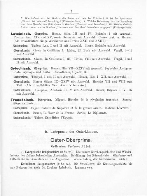 Untersekunda. Xenophon, Anabasis II—V mit Auswahl. Homer, Odyssee I, V—IX mit Auswahl. Französisch. Oberprima. Mignet, Histoire de la révolution française. Sarcey, Siège de Paris. Unterprima. Ségur Histoire de Napoléon et de la grande armée. Molière, L'Avare. Obersekunda. Bruno, Le Tour de la France. Scribe, Le Diplomate. Untersekunda. Thiers, Expédition d'Egypte.