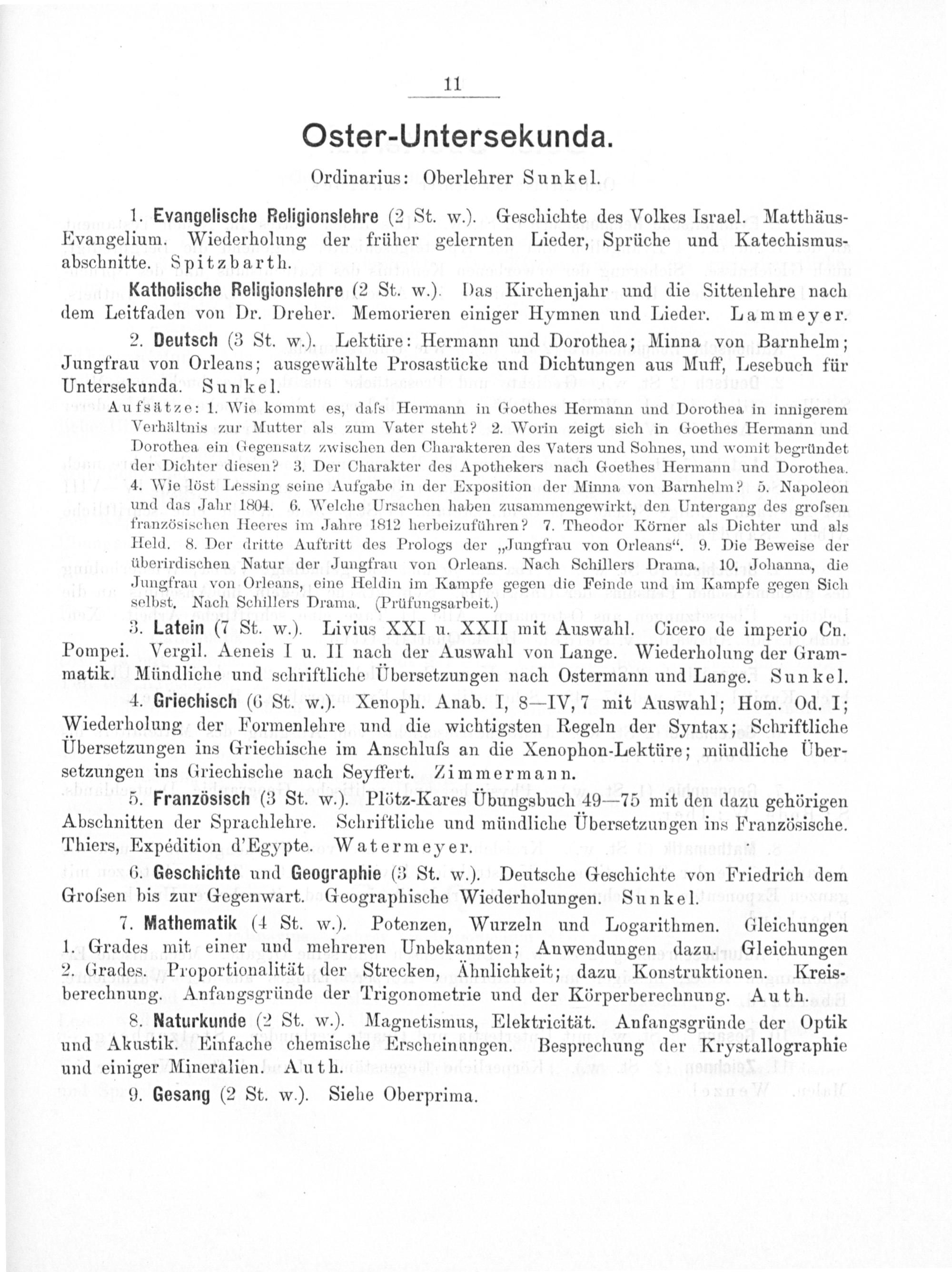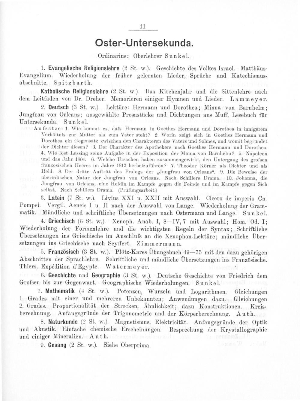 Oster-Untersekunda. Ordinarius: Oberlehrer Sunkel.